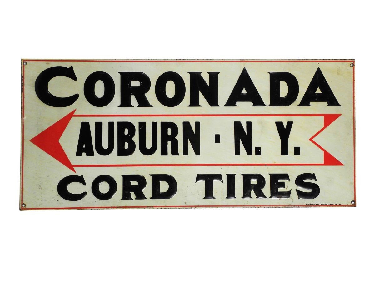 Coronada Cord Tires, embossed tin sign. Auburn, NY. Some minor rust otherwise good condition. 20 X 9 inches.