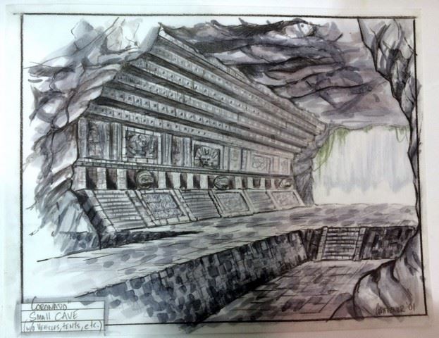 Original Concept Painting of underground Rebel Hideout. Watercolor Marker and colored pencil on vellum. 8.5" x 11". Direct from New Deal Studios. New Deal Studios is a 21st Century Media Studio, unlike any in the world. A full-service film production and visual effects studio, with over 20 years of iconic imagery, New Deal Studios develops, designs, prototypes, and creates all types of high caliber media projects. Founded in 1995 by Matthew Gratzner, Ian Hunter and Shannon Blake Gans, this artist owned and operated independent studio, born in the heyday of visual effects, has truly evolved into the technology driven studio for the future, consistently delivering the perfect marriage of artistry and technology. Award winning credits by New Deal Studios include high-profile projects such as Dark Knight Rises, Hugo, The Avengers, Oz the Great and Powerful, Iron Man, The Dark Knight, Watchmen, I am Legend, Night at the Museum, Whiteout, 2012, Alice in Wonderland, Inception, Battleship and Interstellar.