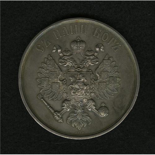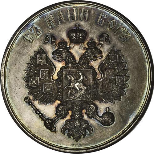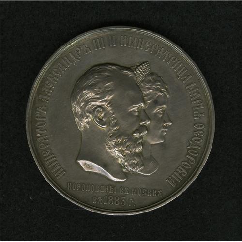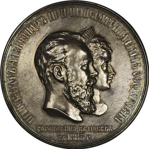 <B>Coronation of Emperor Alexander III and Maria Feodorovna silver medal 1883,</B></I> Conjoined busts right/Imperial eagle, 64 mm, XF and very scarce.<BR><BR><b>Shipping:</b> Coin/Currency (<a target="_blank" href="http://www.heritageauctions.com/common/shipping.php">view shipping information</a>)