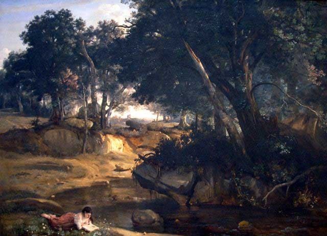 Artist: Jean-Baptiste-Camille Corot - Title: Forest of Fontainebleau - Medium: Fine Art Reproduction Giclee on Canvas - Image Size: Approximately 14.5 inches x 20 inches - Unframed on Unstretched Canvas - Biography: Jean-Baptiste-Camille Corot (July 16, 1796 - February 22, 1875) was a French landscape and portrait painter as well as a printmaker in etching. He is a pivotal figure in landscape painting and his vast output simultaneously referenced the Neo-Classical tradition and anticipated the plein-air innovations of Impressionism.