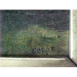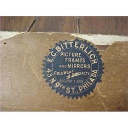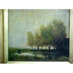 Corot oil on wood panel, landscape with cows, signed Corot (L.R.), image measures 8 1/2" x 9 3/8", stamped on back wood panel, Flor Americana Haba..., old numbered auction sticker on back, label on back of frame E.C. Bitterich, 43 N. 9th St. Philada.