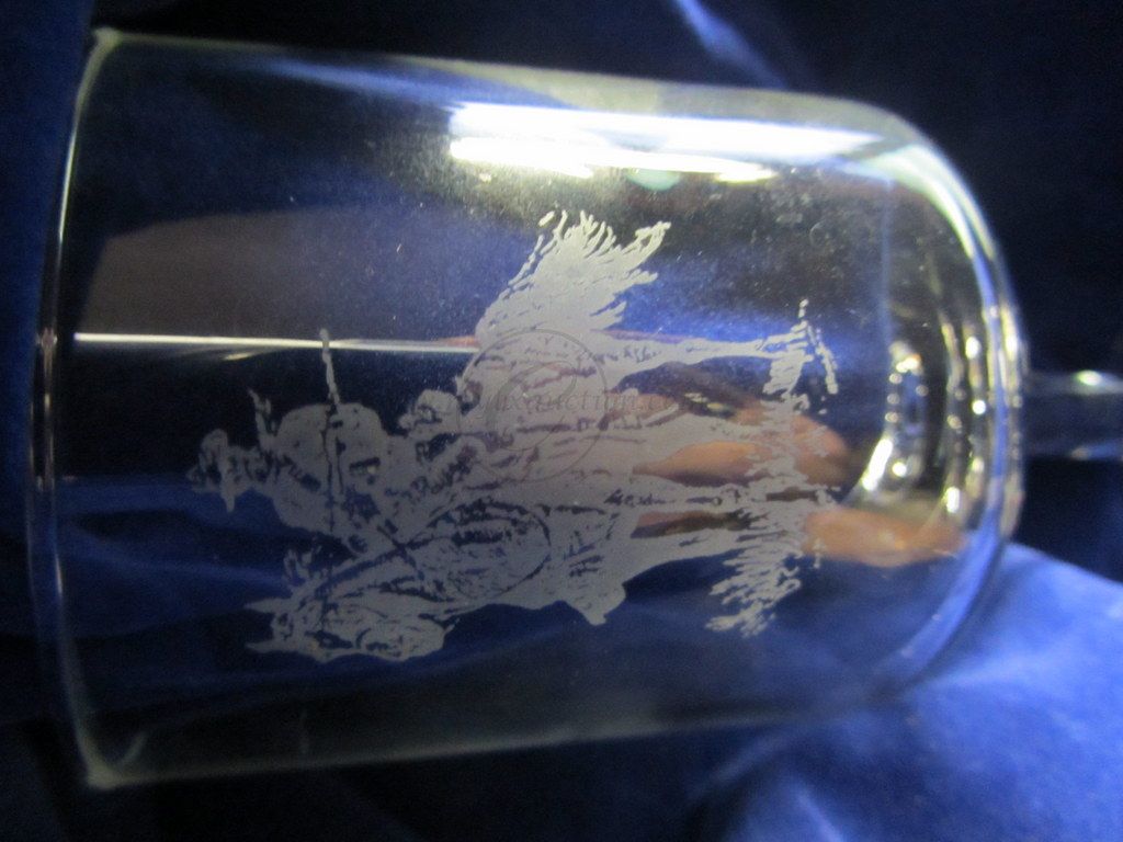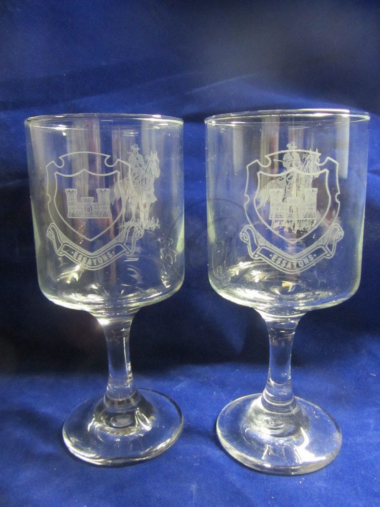 A pair of Rare (can not find) wine/water goblets/stemware made by the Libbey Glass, Inc. These goblets have the Army Corps of Engineering Crest (Castle with the word Essayons) on one side and the Cavalry horseman emblem on the other. Glasses measures over all 5 5/8" tall, beverage reservoir is 2.75" tall x 2.5" across opening x 2 3/8" across base, holds approx.. 4.5oz Both glasses have no noticed defects great addition to your military collection.