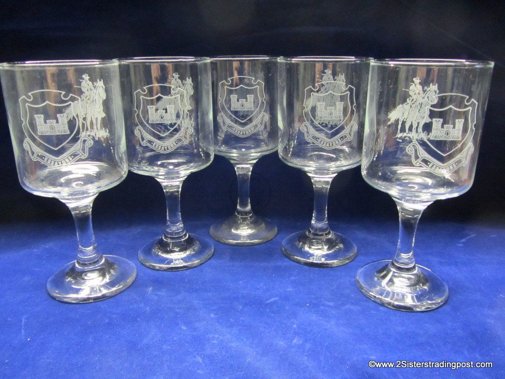 A set of 4 Rare (can not find) wine/water goblets/stemware made by the Libbey Glass, Inc. These goblets have the Army Corps of Engineering Crest (Castle with the word Essayons) on one side and the Cavalry horseman emblem on the other. Glasses measures over all 5 5/8" tall, beverage reservoir is 2.75" tall x 2.5" across opening x 2 3/8" across base, holds approx.. 4.5oz Both glasses have no noticed defects great addition to your military collection.