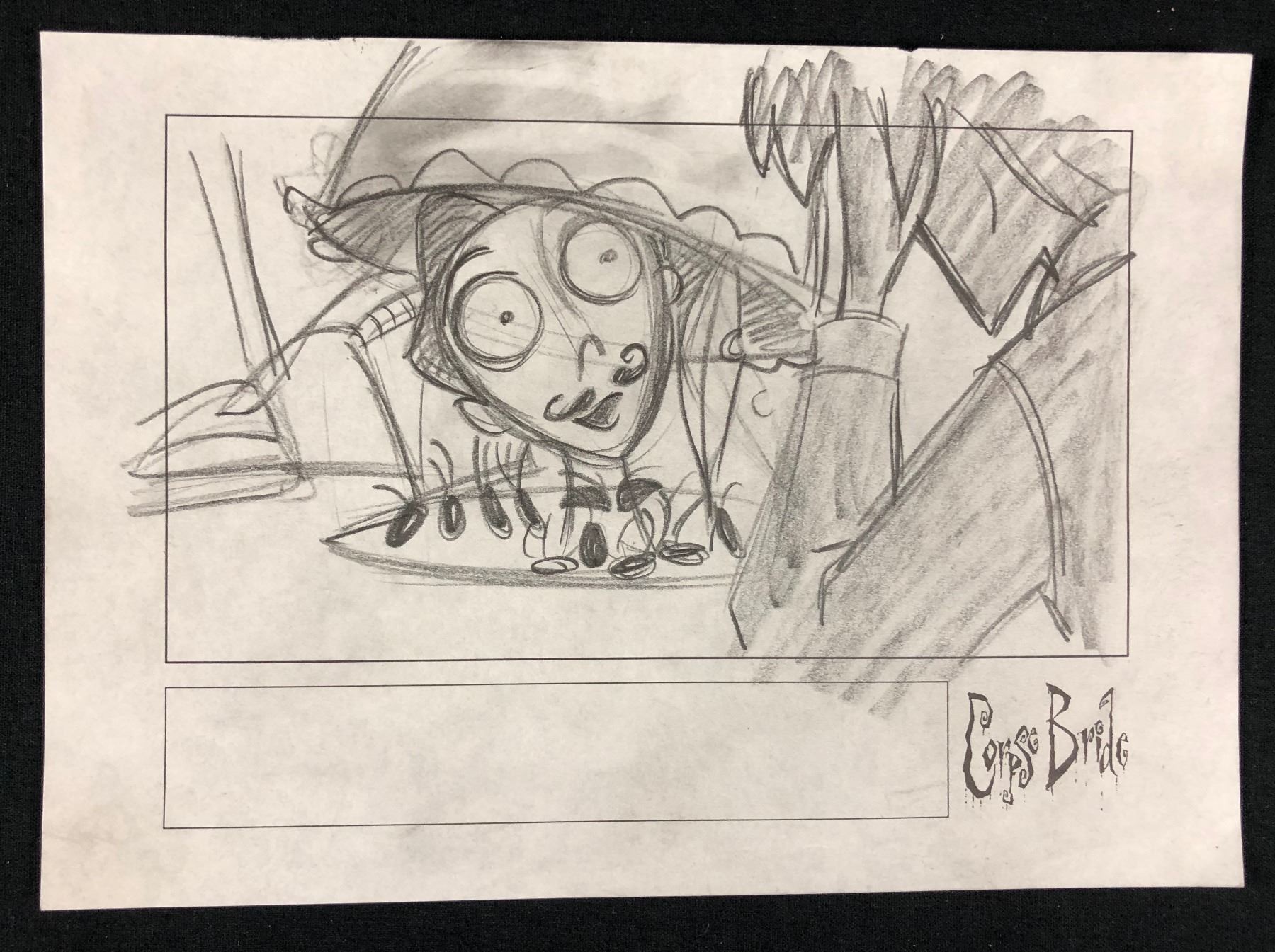 Original storyboard page all hand drawn from the Tim Burton directed stop-motion animated musical dark comedy " Corpse Bride (2005), where a shy groom practices his wedding vows in the inadvertent presence of a deceased young woman, she rises from the grave assuming he has married her. Johnny Depp leads the cast as the voice of Victor, while Helena Bonham Carter voices Emily, the titular bride.