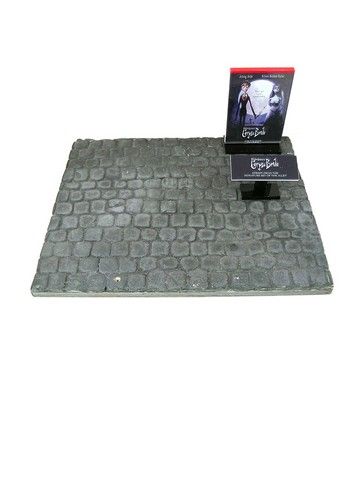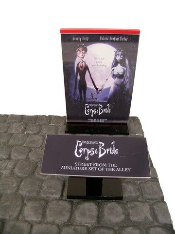 Screen used section of cobblestone street from the set of the alley used in Tim Burton's stop-motion cult-classic feature "Corpse Bride". This piece is seen at entrance of Church in the big wedding sequence. Comes with 5"x5" display reading in trademarked logo type "Tim Burton's Corpse Bride: STREET FROM THE MINIATURE SET OF THE ALLEY", plus a second Plexiglas framed 5"x8" display of the actual Corpse Bride poster of Victor Van Dort and the Corpse Bride walking over the cobblestone street to their wedding. (Set piece is approx. 20"x17").