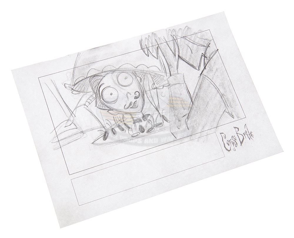 (Warner Bros., 2005) This original storyboard page is hand drawn in pencil and depicts Paul The Head Waiter (Paul Whitehouse) speaking with Victor Van Dort (Johnny Depp). Title and scene details box are in the margins. The storyboard remains in very good condition with only minor wear from use and measures 8.25" x 5.75". This storyboard is a unique one-of-a-kind original production artifact for the Tim Burton stop motion classic.