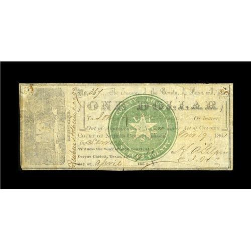 <B>Corpus Christi, TX- Nueces County</B></I> $1 April 19, 1862 Medlar UNL<BR>Nueces County is an exceptionally rare county issuer, as Medlar lists five different notes but indicates "No information available" for four of them. This denomination is unlisted with the 1862 date. <B>Fine,</B></I> with an old inventory tag and a couple of hinge repairs on the reverse.<BR><I>From The William A. "Bill" Bond Collection</B></I><BR><BR><b>Shipping:</b> Coin/Currency (<a target="_blank" href="http://www.heritageauctions.com/common/shipping.php">view shipping information</a>)