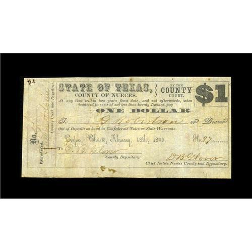 <B>Corpus Christi, TX- Nueces County</B></I> $1 Feb. 18, 1863 Medlar 5<BR>A nice example of this rarity 7 issue. <B>Very Fine,</B></I> and, like all of these Nueces County notes, bearing an old inventory tag on the back.<BR><I>From The William A. "Bill" Bond Collection</B></I><BR><BR><b>Shipping:</b> Coin/Currency (<a target="_blank" href="http://www.heritageauctions.com/common/shipping.php">view shipping information</a>)