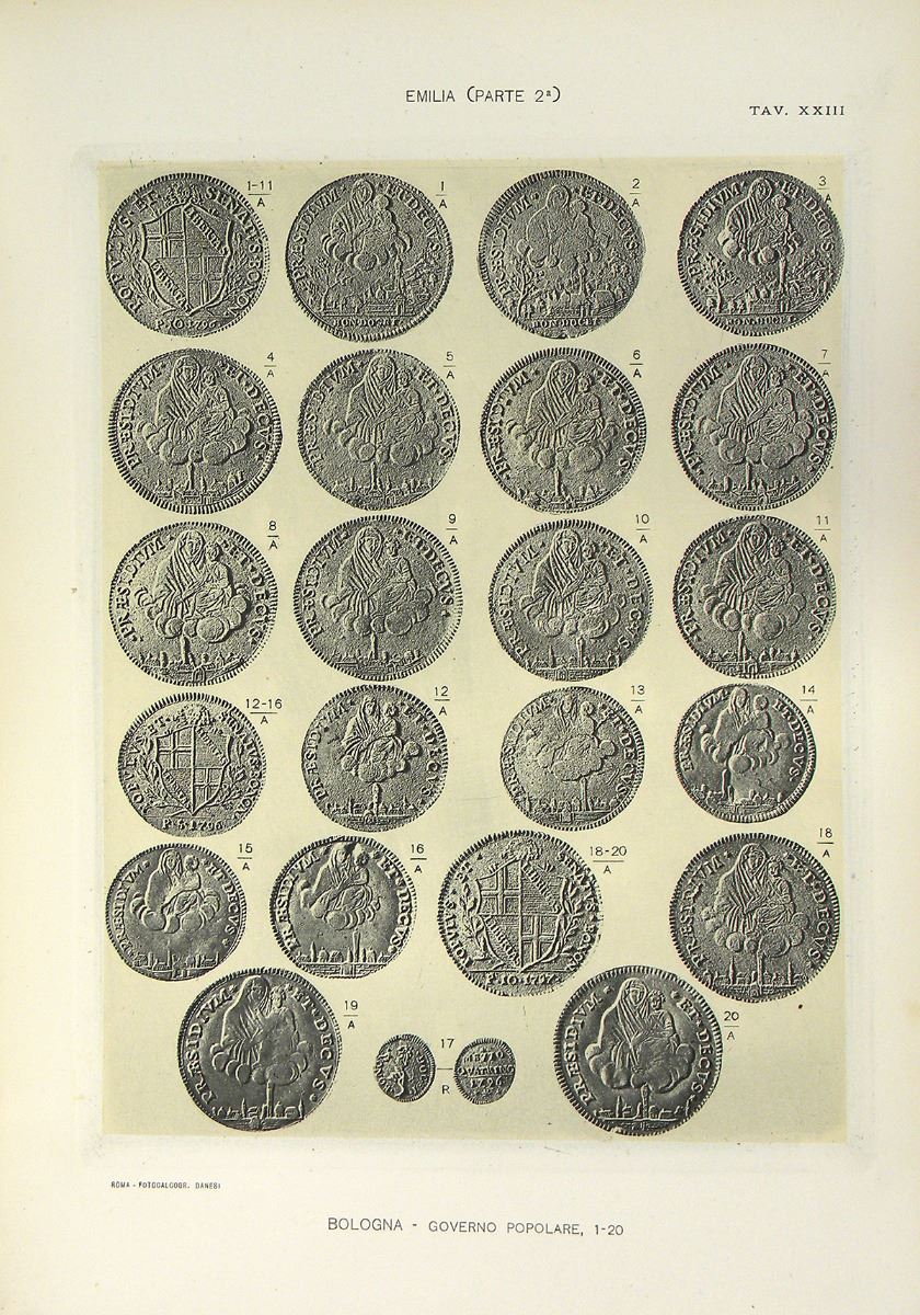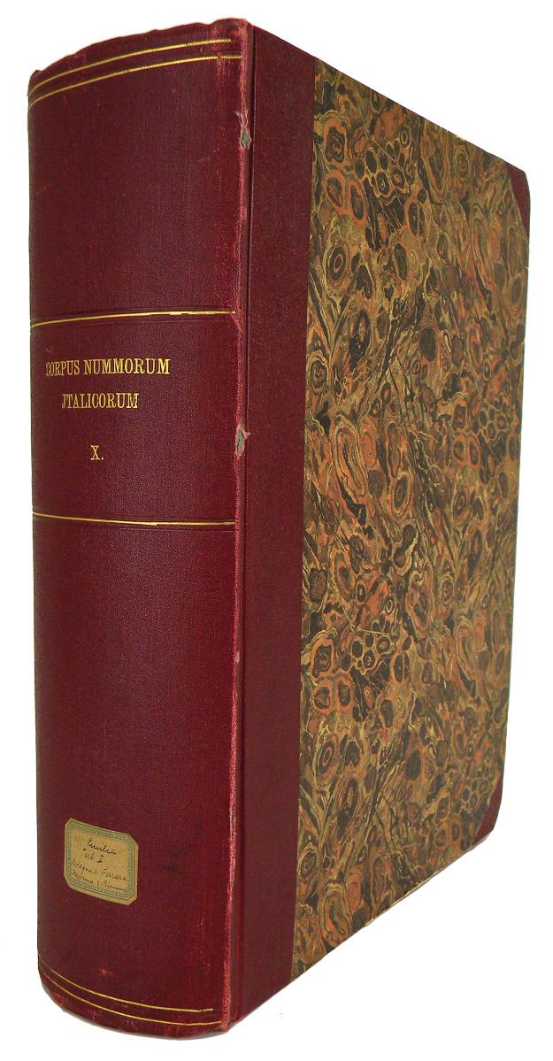 Victor Emmanuel III, King of Italy. CORPUS NUMMORUM ITALICORUM. PRIMO TENTATIVO DI UN CATALOGO GENERALE DELLE MONETE MEDIEVALE E MODERNE CONIATE IN ITALIA O DA ITALIANI IN ALTRI PAESI. VOLUME IX: EMILIA (PARTE 1a) PARMA E PIACENZA-MODENA E REGGIO. Roma, 1925. (6), 792 pages; 44 fine plates of coins. [with] VOLUME X: EMILIA (PARTE 2a). BOLOGNA E FERRARA - RAVENNA E RIMINI. Roma, 1927. (6), 763, (1) pages; 48 fine plates of coins. Two thick folio volumes, contemporary red cloth, gilt, with marbled boards. Very good or better. See catalogue for full description.
