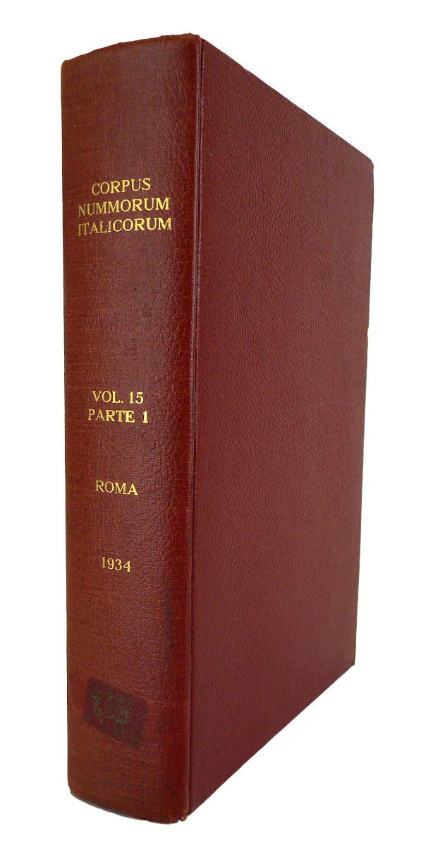 Victor Emmanuel III, King of Italy. CORPUS NUMMORUM ITALICORUM. PRIMO TENTATIVO DI UN CATALOGO GENERALE DELLE MONETE MEDIEVALE E MODERNE CONIATE IN ITALIA O DA ITALIANI IN ALTRI PAESI. VOLUME XV: ROMA PARTE I - DALLA CADUTA DELL'IMPERO D'OCCIDENTE AL 1572. Roma, 1934. (6), 552 pages; 28 fine plates of coins. [with] VOLUME XVI: ROMA PARTE II - DAL 1572 AL 1700. Roma, 1936. (4), 523, (1) pages; 40 fine plates of coins. Two thick folio volumes, first in later pebbled red cloth, gilt, the second in blue half leather with marbled boards, gilt. Very good to fine. See catalogue for full description.