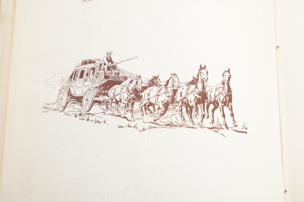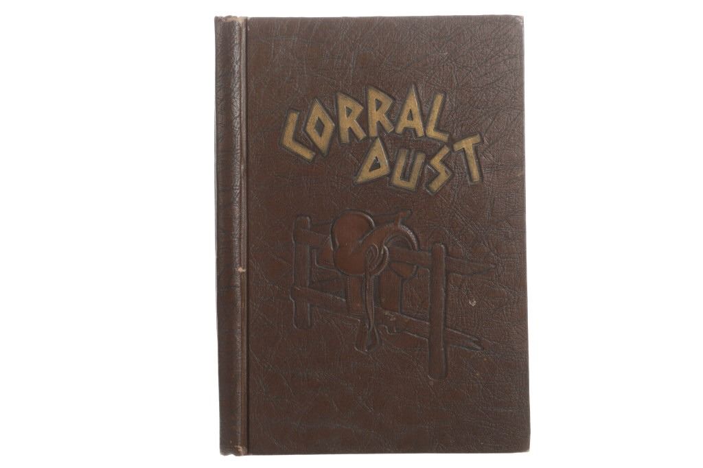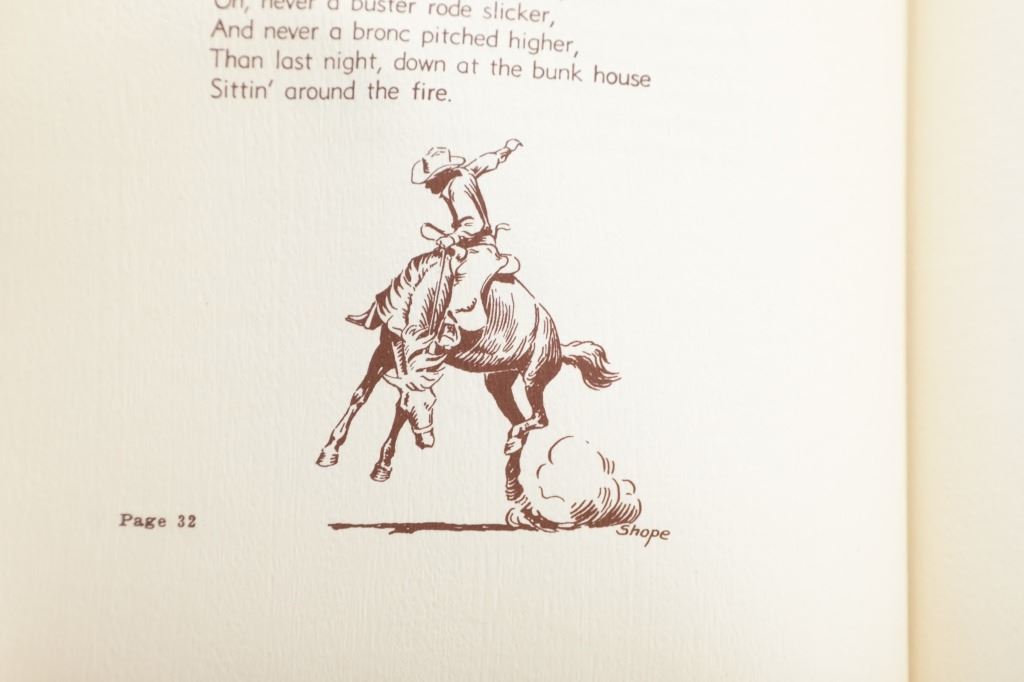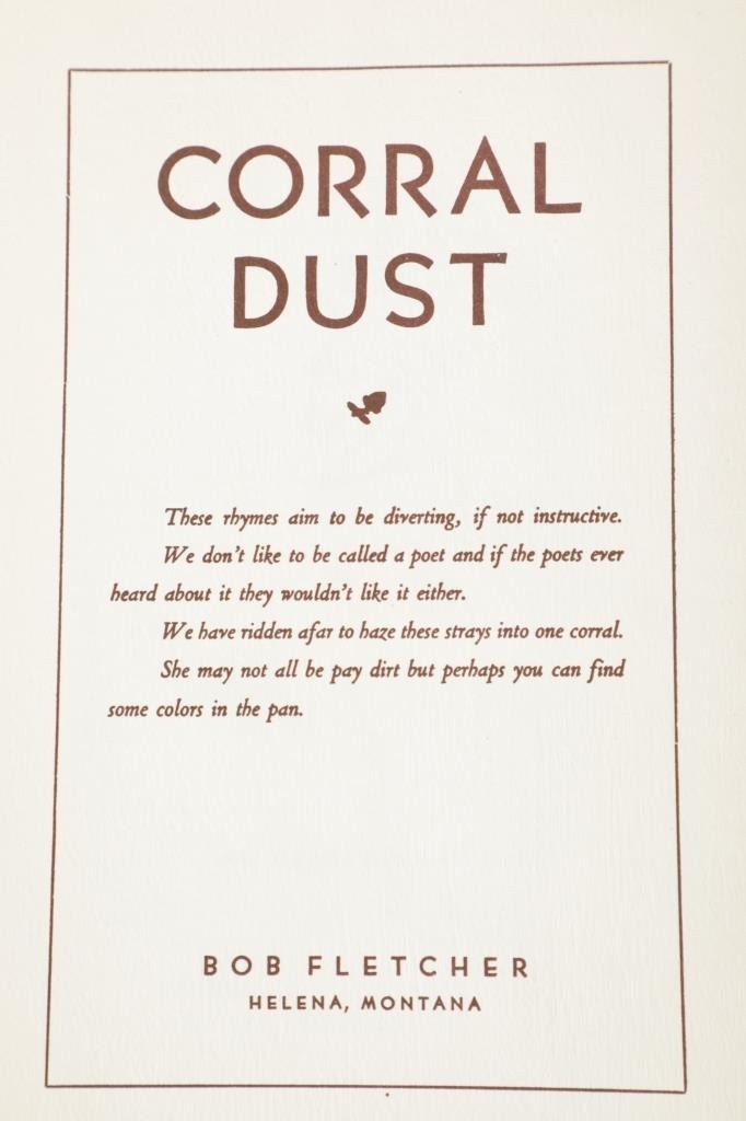 Presented is the book of Western Verse, "Corral Dust", by Bob Fletcher 1936, drawings by Shorty Shope. Robert H. Fletcher, was a Western poet and writer perhaps best know as the uncredited writer of the lyrics to Cole Porter 's song, “Don't Fence Me In." His writings included a novel on the early days in the Montana cattle business, “From Free Grass to Fences.” Formerly of Butte, Montana, Fletcher moved to Helena, Montana to work for the Montana Highway Department to promote tourism in Montana. In about 1935 he was instrumental in the creation of "Ports of Entry" at major highways entering Montana, where visitors were provided with information about Montana's history and points of interest. He became a student of Montana history, and with that background he wrote the text for a series of historical markers displayed throughout Montana in the mid-1930s. Several compilations of those markers have been published. In the 1950s he was commissioned by the Montana Cattlemen's Association to write a history of the cattle industry in Montana titled "Free Grass to Fences." He was an early "cowboy poet".