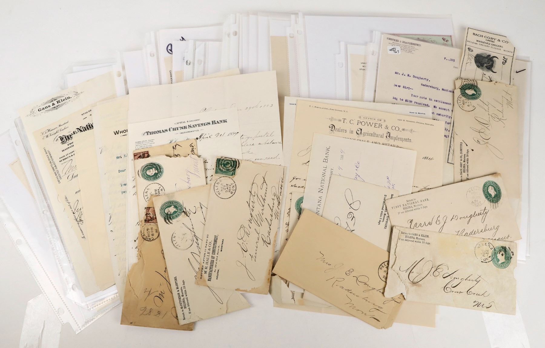 Group of original correspondence including letters and envelopes from creditors of J. Daugherty of Radersburg, Montana. Perhaps 50 or more pieces, plus covers. Letters from merchants, banks and individuals trying to get paid, obviously during tough times. The fact that these letters were carefully saved by Daugherty may indicate his intent to get them paid, if not already done so. Radersburg was a gold mining camp, discovered about 1865. It became the Jefferson County seat. But as the gold dwindled, so did business, and soon the county seat was moved to Boulder in 1883, the year this correspondence starts, reflective of the severe business downturn. The letters reflect payments from Daugherty in currency and gold.