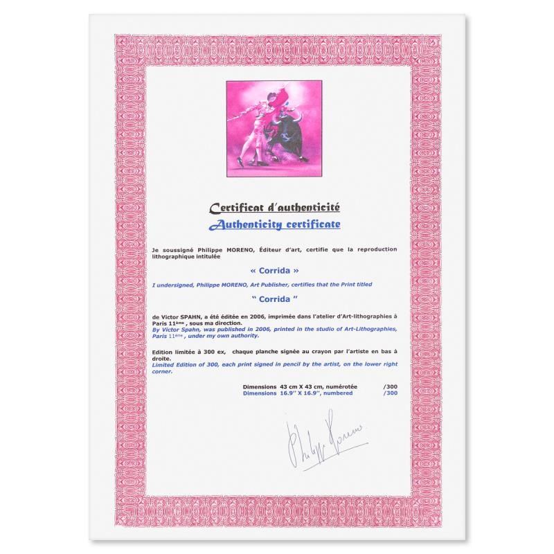 Corrida is a limited edition lithograph on paper by Victor Spahn. Printed at Art-Lithographies workshop in Paris, the piece is hand signed by the artist and comes with a certificate of authenticity. Measures approximately 17 x 17 (image).