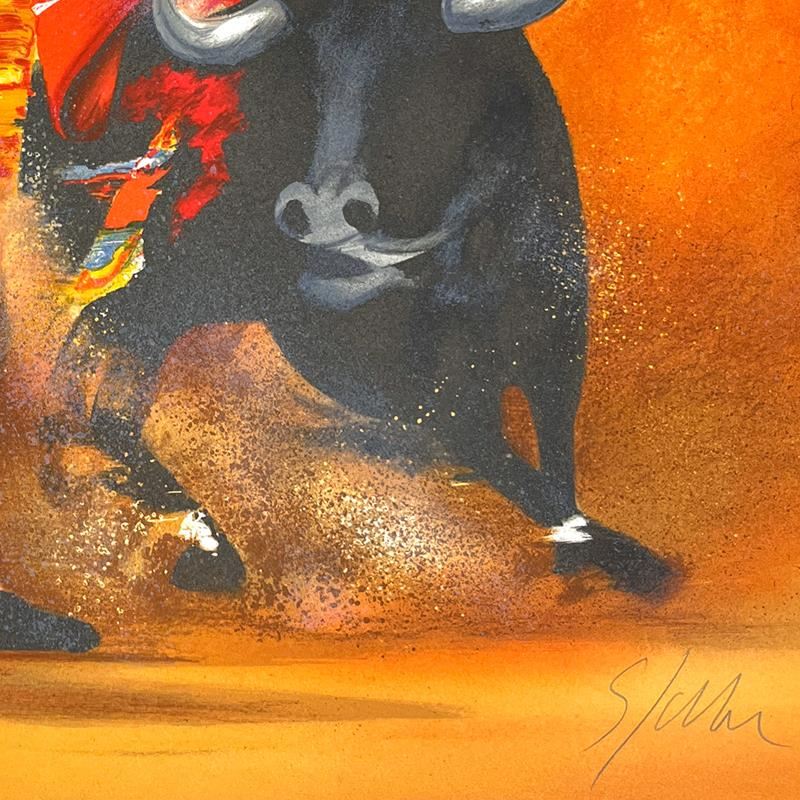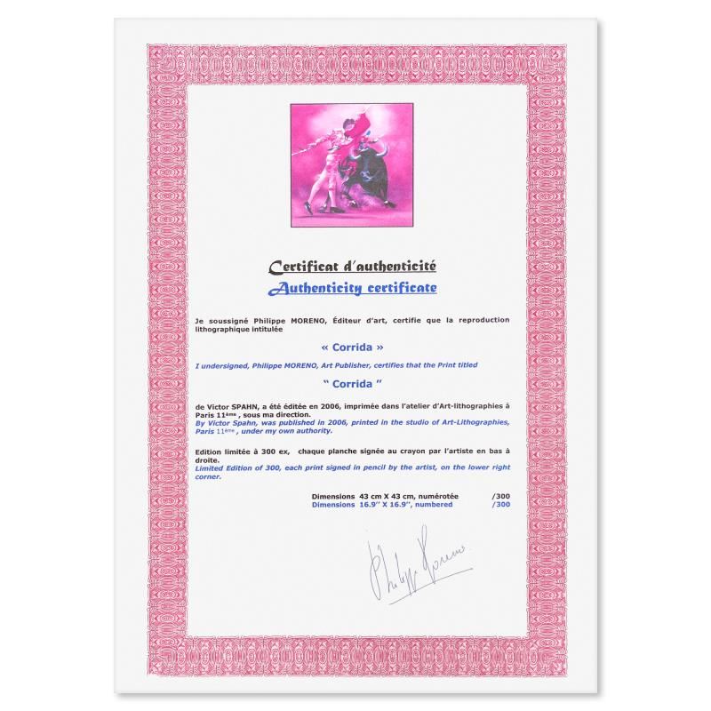 "Corrida" is a limited edition lithograph on paper by Victor Spahn. Printed at Art-Lithographies workshop in Paris the piece is hand signed by the artist and comes with a certificate of authenticity. Measures approximately 17" x 17" (image).