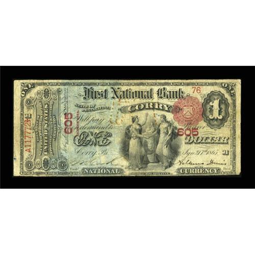 <B>Corry, PA</B></I> - $1 1875 Fr. 383 <B>The First NB</B></I> Ch. # 605<BR> Examples from this Erie County locale are prohibitively rare. A few weak areas in the paper and some paper clip marks attest to its use in commerce. This now brings the total to five notes known from this bank, whose issue was large size only. <B>Very Good</B></I>.<BR><BR><b>Shipping:</b> Coins & Currency (<a target="_blank" href="http://www.heritageauctions.com/common/shipping.php">view shipping information</a>)