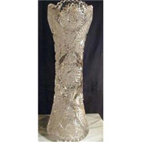 Exquisite cut Crystal Vase in the corset shape, Sunburst pattern. It has a scalloped, jagged edge at the top. A hole has been drilled in the bottom to use it for a lamp base instead of vase. It is 6.5" in diameter at the top and 7" in diameter at the bottom. It is breathtaking in the sunlight and looks beautiful with an elegant silk flower arrangement.
