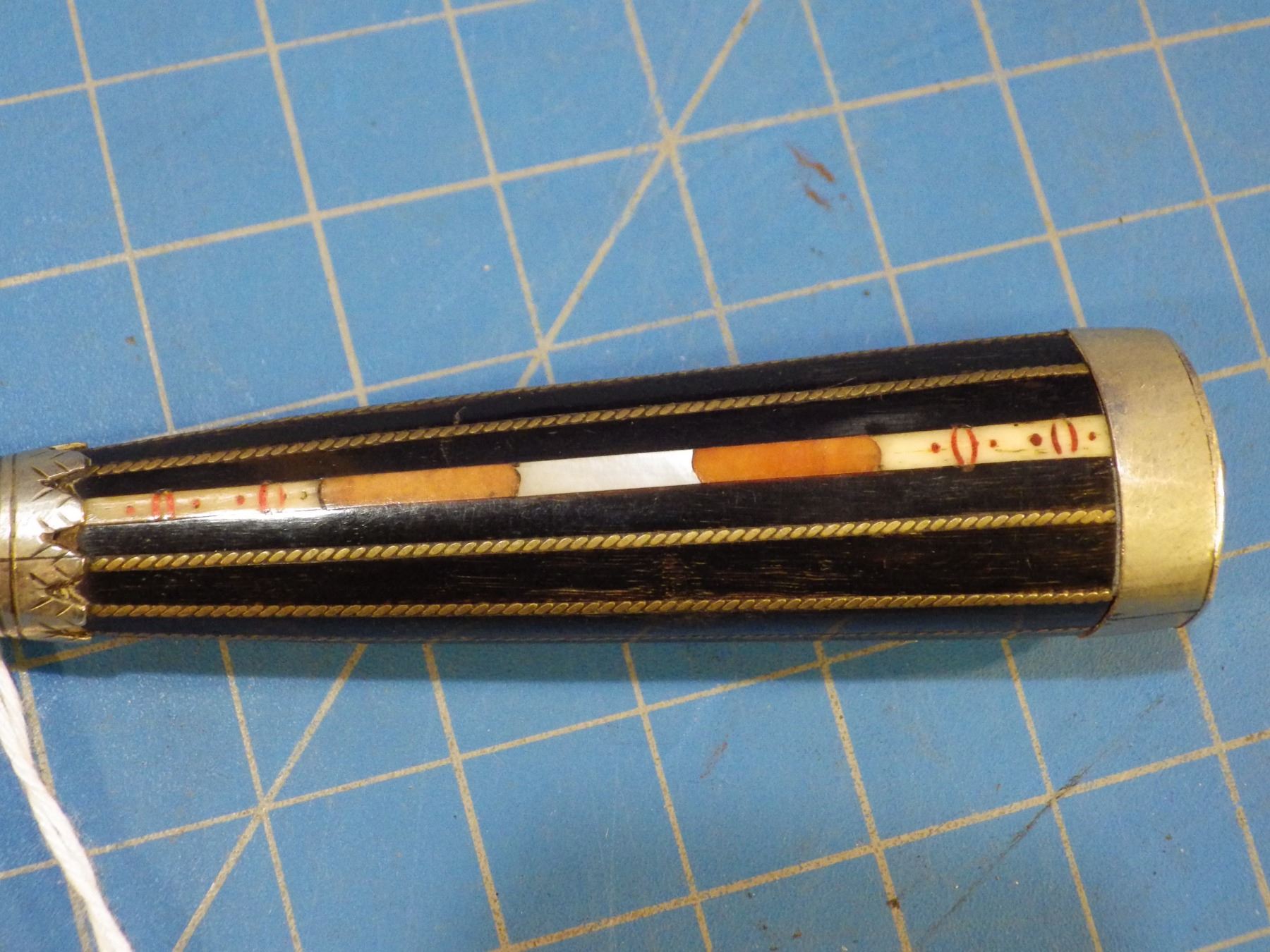 Corsican vendetta dagger with 5 3/4" double edged blade, with silver fittings on sheath and handle, handle with inlaid with what appear to be semi-precious stones
