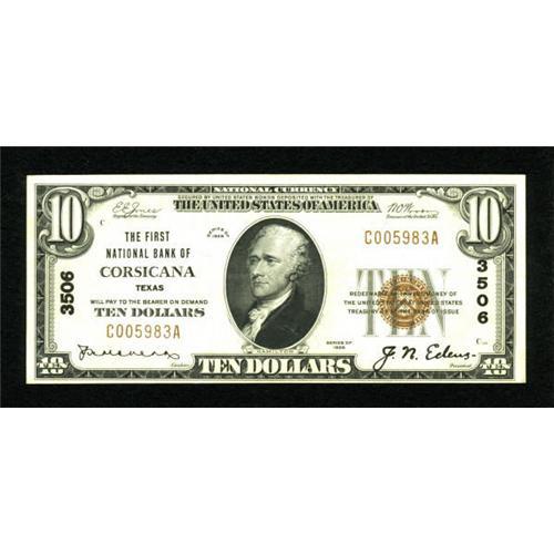 <B>Corsicana, TX</B></I> - $10 1929 Ty. 1 <B>The First NB</B></I> Ch. # 3506<BR> A vertical and horizontal fold are noted on this otherwise attractive and original piece. <B>Extremely Fine-About Uncirculated.</B></I><BR><BR><b>Shipping:</b> Coins & Currency (<a target="_blank" href="http://www.heritageauctions.com/common/shipping.php">view shipping information</a>)