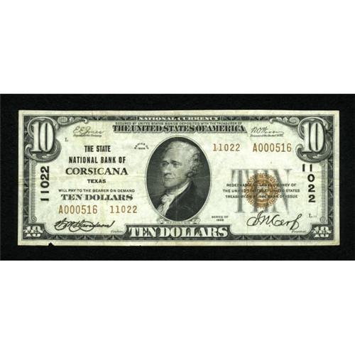 <B>Corsicana, TX</B></I> - $10 1929 Ty. 2 <B>The State NB</B></I> Ch. # 11022<BR> This is one of a mere two Type 2 $10s in the census. This Navarro County bank has a total Type 2 population of seven notes with Type 1s outnumbering Type 2s by six to one. <B>Very Fine</B></I>, small bottom edge notch<BR><BR><b>Shipping:</b> Coins & Currency (<a target="_blank" href="http://www.heritageauctions.com/common/shipping.php">view shipping information</a>)