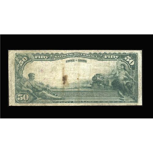 <B>Corsicana, TX</B></I> - $50 1902 Date Back Fr. 668 <B>The First NB </B></I> Ch. # (S) 3506<BR>This is the only recorded $50 Date Back for the bank, and, with only 75 notes recorded of this type for the entire state of Texas, expect bidding to possibly exceed the estimates. A stain on back hinders the note, and has a single small hole from erosion next to it.