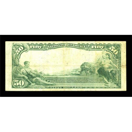 <B>Corsicana, TX</B></I> - $50 1902 Plain Back Fr. 682 <B>The State NB</B></I> Ch. # 11022<BR> A handful of large size notes are known from this Navarro County bank, though only four are high denominations. The cut at top and bottom is somewhat tight. The stamped signatures are weak and there is a split on the left margin into the design. <B>Fine-Very Fine.</B></I><BR><BR><b>Shipping:</b> Coins & Currency (<a target="_blank" href="http://www.heritageauctions.com/common/shipping.php">view shipping information</a>)