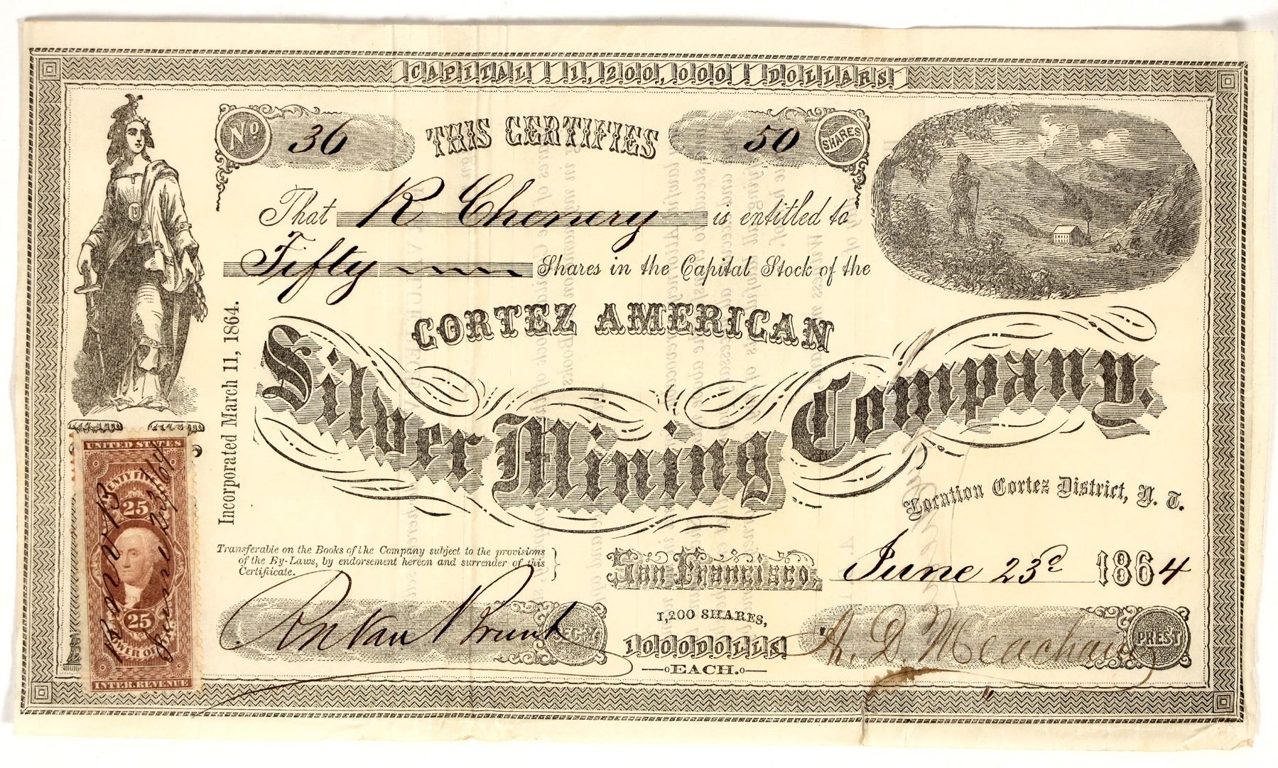Very rare; we have no records of selling this before. "Location Cortez District, N.T." (printed under title). No. 36, issued for 50 shares to R. Cheney in San Francisco in 1864. Signed by president Meacham and secretary R. Van Brunt. Not cancelled. Two vignettes. Not printer listed. 25 cent revenue stamp at lower left. Deep folds, creases, wrinkles, tear on fold. 5.5 x 9.25" No additional information located on newspapers.com. Cortez is a ghost town in Lander County. "The Cortez district was discovered in 1862 by prospectors from the silver camp of Austin, about fifty miles to the south. From 1864 to 1867 Simeon Wenban and George Hearst, in partnership, mined rich ores in the district. In 1867 Wenban bought out Hearst, acquired all the important mines in the district and operated them until his death in 1895. [Actually, 1901] The period from 1864 to 1895 was the most productive in the district's history, with the bulk of the production in silver, although minor amounts of gold, lead and copper were recovered. Much of the ore was very rich, running into hundreds of ounces of silver per ton. During the period 1923 to 1930 Consolidated Cortez Silver Mines operated a 100 ton per day concentration plant mining deeper ore and also recovering some of the lower grade back-fill residue from earlier operations. In other periods from1895 to 1959 various lessees conducted small operations in the district." Cortez Gold Mines Report, 1969