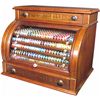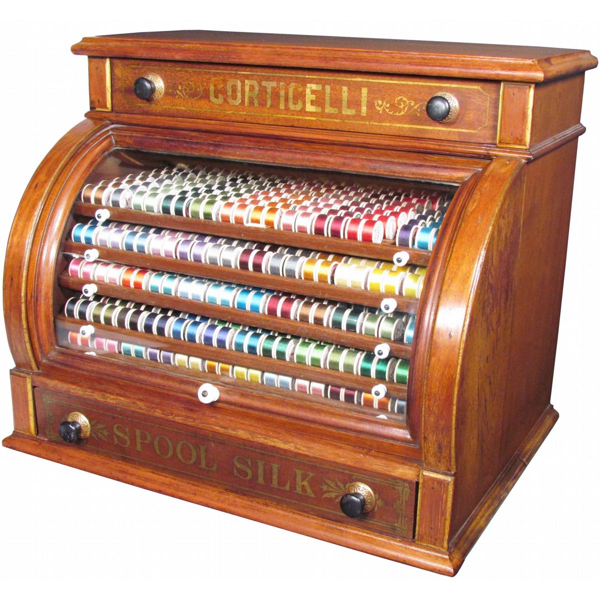 Corticelli Curved Glass Front Spool Cabinet. Original decal and hardware. Excellent all original condition. 21 1/2 X 18 X 16 inches.
