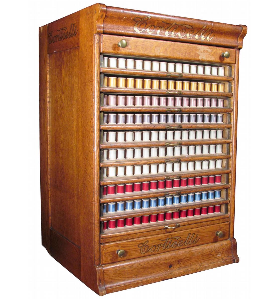 Corticelli Glass Front Spool Cabinet. Original decals and hardware with 12 drawers. Excellent all original condition. 21 X 31 3/8 X 18 5/8 inches.