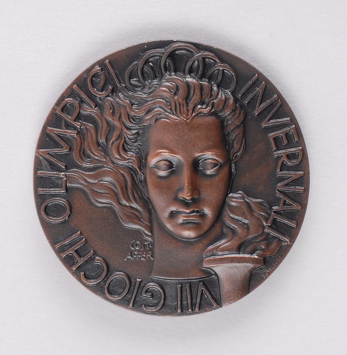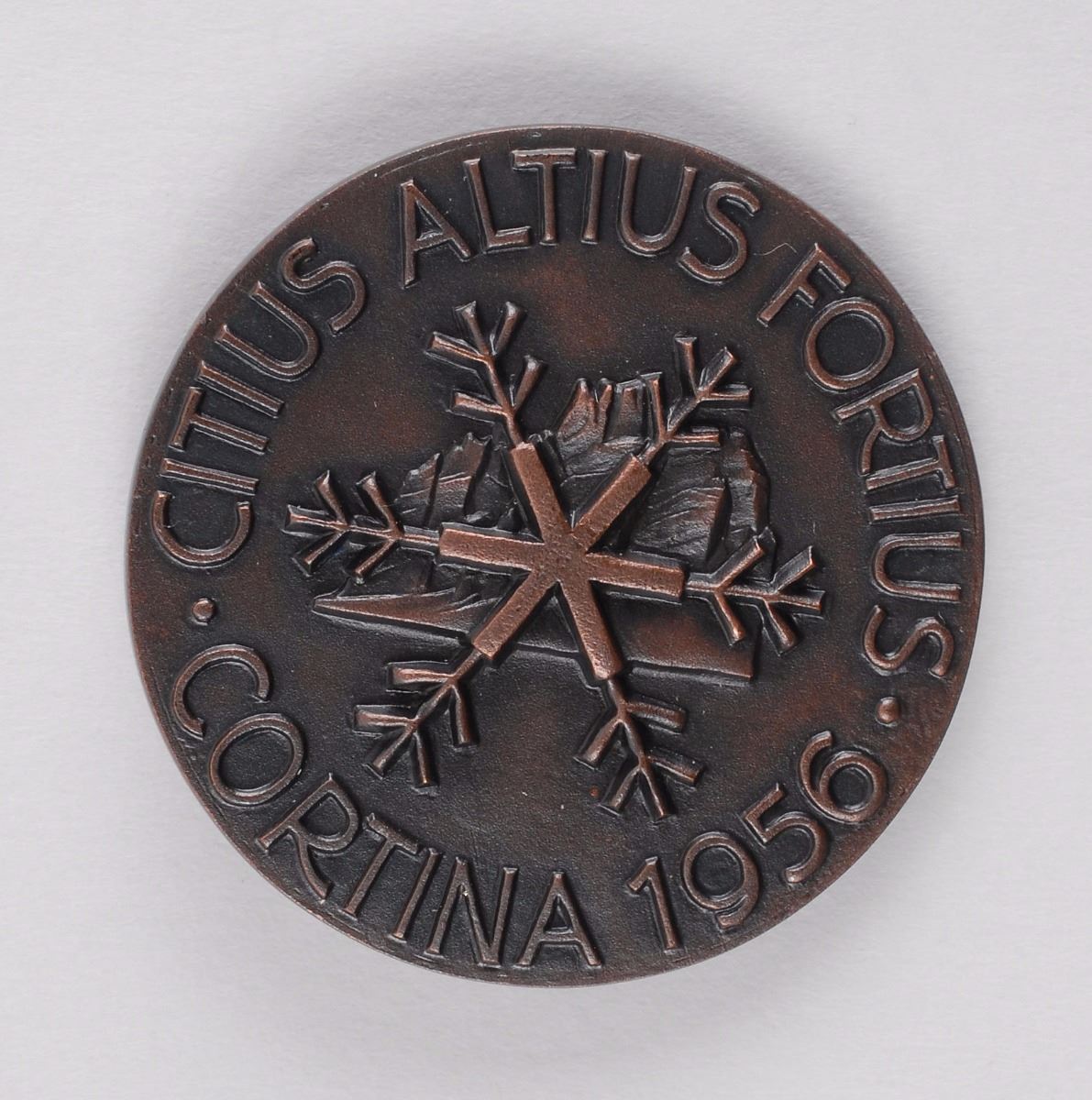 Participation medal issued for the 1956 Cortina Winter Olympics. Bronze, 40 mm, 34 gm, by Constantino Affer. The front features the head of Victory crowned with Olympic rings and encircled with raised text, “VII Giochi Olimpici Invernali”; the reverse depicts a snowflake over Mt. Pomagagnon, with raised text, “Citius, Altius, Fortius, Cortina 1956.” An unusually small example of the beautiful Cortina commemoration medal.