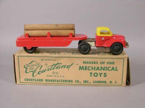 Cortland log hauler - keywind tin toy in original box, motor guaranteed for life. 12" long. Ex. cond.