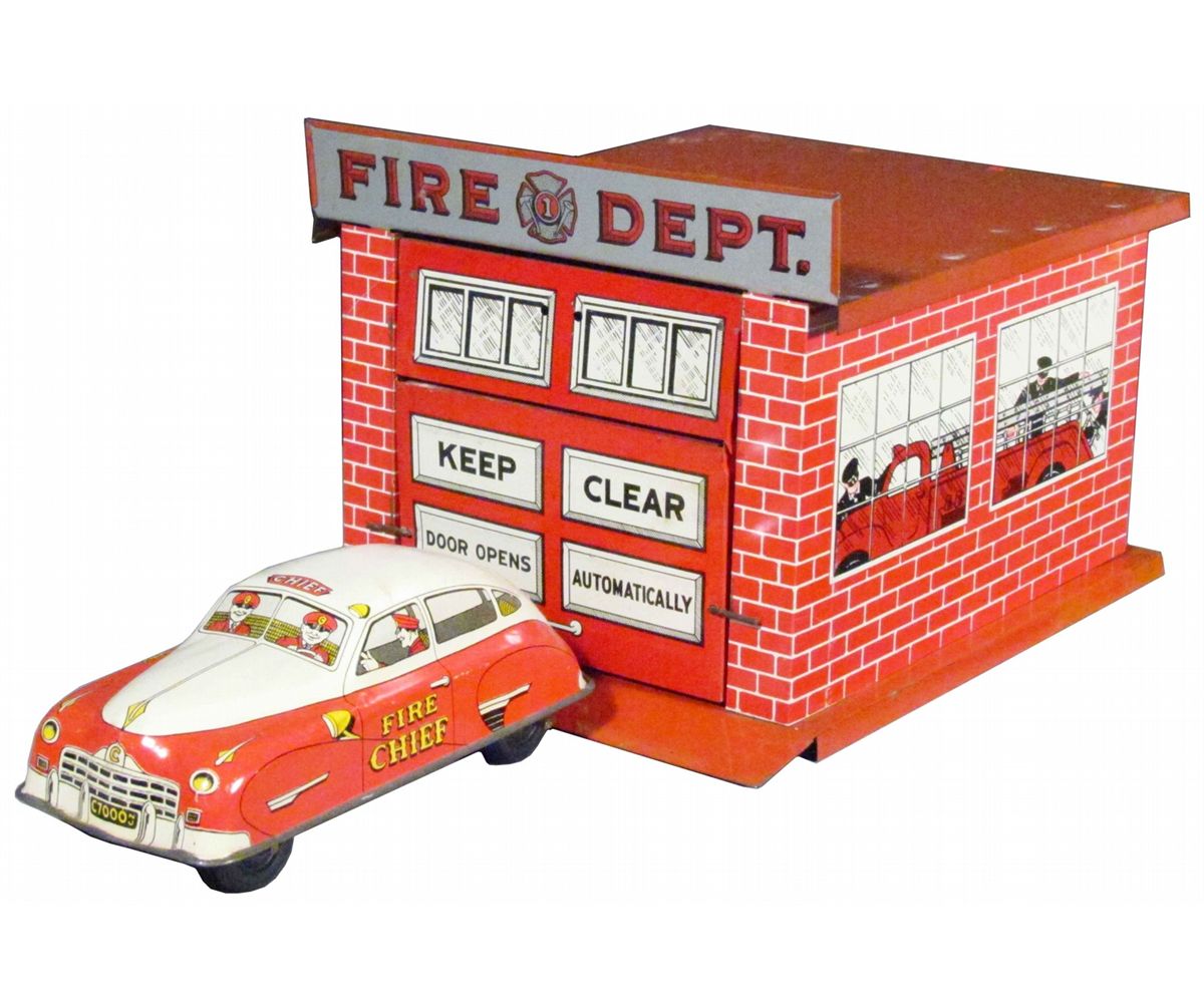 Cortland Tin Toy Fire Station and Chief Car. Excellent all original condition. Station measures 8 X 7 X 10 inches.
