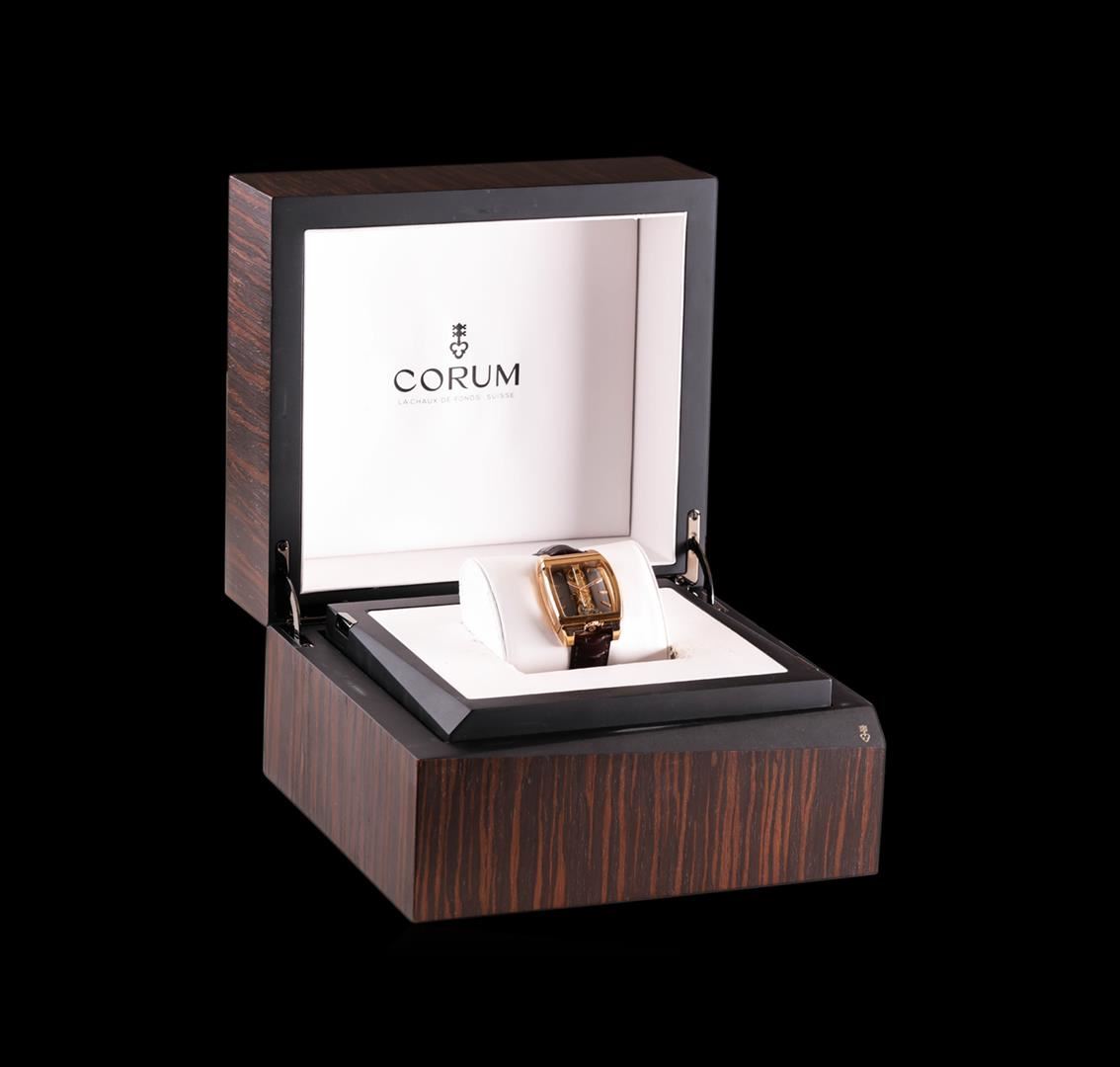 One, Corum Golden Bridge Automatique 18KT Red Gold Wristwatch, Swiss Hallmarked Case: 52 x 37mm, Water Resistant 30 meters / 100 feet, Case Back: synthetic sapphire exposition, the case back frame is engraved with the manufacturers name, logo, information and ID numbers. Crown: six o'clock position, scalloped with Corum high relief key logo, Fixed Bezel: high polish finish, Crystal: synthetic sapphire, Slate color Dial: Corum Signed Bridges and plate, with raised indices and pointed hands. Corum Movement: automatic, Power Reserve: 40 hours, Corum alligator strap: Black color, saddle stitched, Swiss Hallmarked Corum 18KT Red gold clasp with logo, Condition: G-7 Near Mint. Eight and one half inch length, adjustable. Total Weight of Watch 132.39gm. AIG Appraised at $52,000.00.