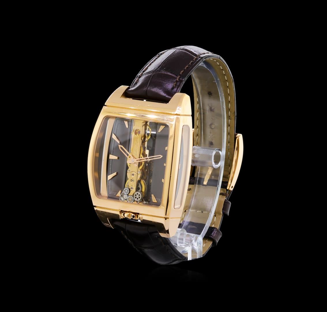 One, Corum Golden Bridge Automatique 18KT Red Gold Wristwatch, Swiss Hallmarked Case: 52 x 37mm, Water Resistant 30 meters / 100 feet, Case Back: synthetic sapphire exposition, the case back frame is engraved with the manufacturers name, logo, information and ID numbers. Crown: six o'clock position, scalloped with Corum high relief key logo, Fixed Bezel: high polish finish, Crystal: synthetic sapphire, Slate color Dial: Corum Signed Bridges and plate, with raised indices and pointed hands. Corum Movement: automatic, Power Reserve: 40 hours, Corum alligator strap: Black color, saddle stitched, Swiss Hallmarked Corum 18KT Red gold clasp with logo, Condition: G-7 Near Mint. Eight and one half inch length, adjustable. Total Weight of Watch 132.39gm. AIG Appraised at $52,000.00.