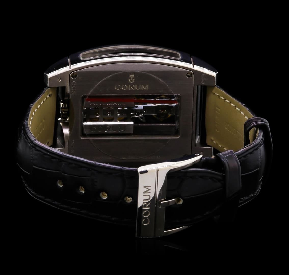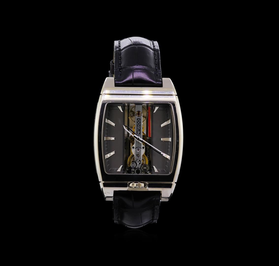 One, Corum Golden Bridge Automatique 18KT White Gold Wristwatch, Swiss Hallmarked Case: 52 x 37mm, Water Resistant 30 meters / 100 feet, Case Back: synthetic sapphire exposition, the case back frame is engraved with the manufacturers name, logo, information and ID numbers. Crown: six o'clock position, scalloped with Corum high relief key logo, Fixed Bezel: high polish finish, Crystal: synthetic sapphire, Slate color Dial: Corum Signed Bridges and plate, with raised indices and pointed hands. Corum Movement: automatic, Power Reserve: 40 hours, Corum alligator strap: Black color, saddle stitched, Swiss Hallmarked Corum 18KT White gold clasp with logo, Condition: G-7 Near Mint. Eight and one half inch length, adjustable. Total Weight of Watch134.44gm. AIG Appraised at $52,000.00.