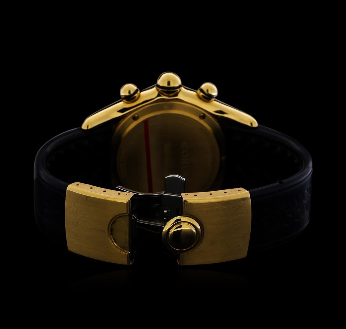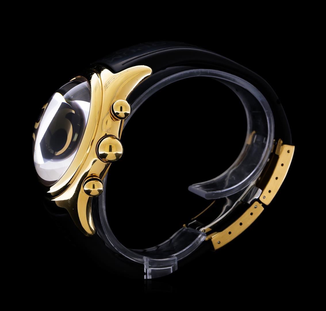 One Corum Bubble men's watch featuring: Case: 18KT yellow gold. Bezel: 18KT yellow gold. Crystal: Sapphire. Crown: Screwdown. Dial: Black color; Arabic numerals. Functions: Chronograph; date; small seconds sub-dial. Bracelet: Corum black rubber strap with 18KT yellow gold double fold over clasp. Water Resistance: 200m/660ft. Condition: Minor surface scratches on case, but otherwise there are no major signs of wear.