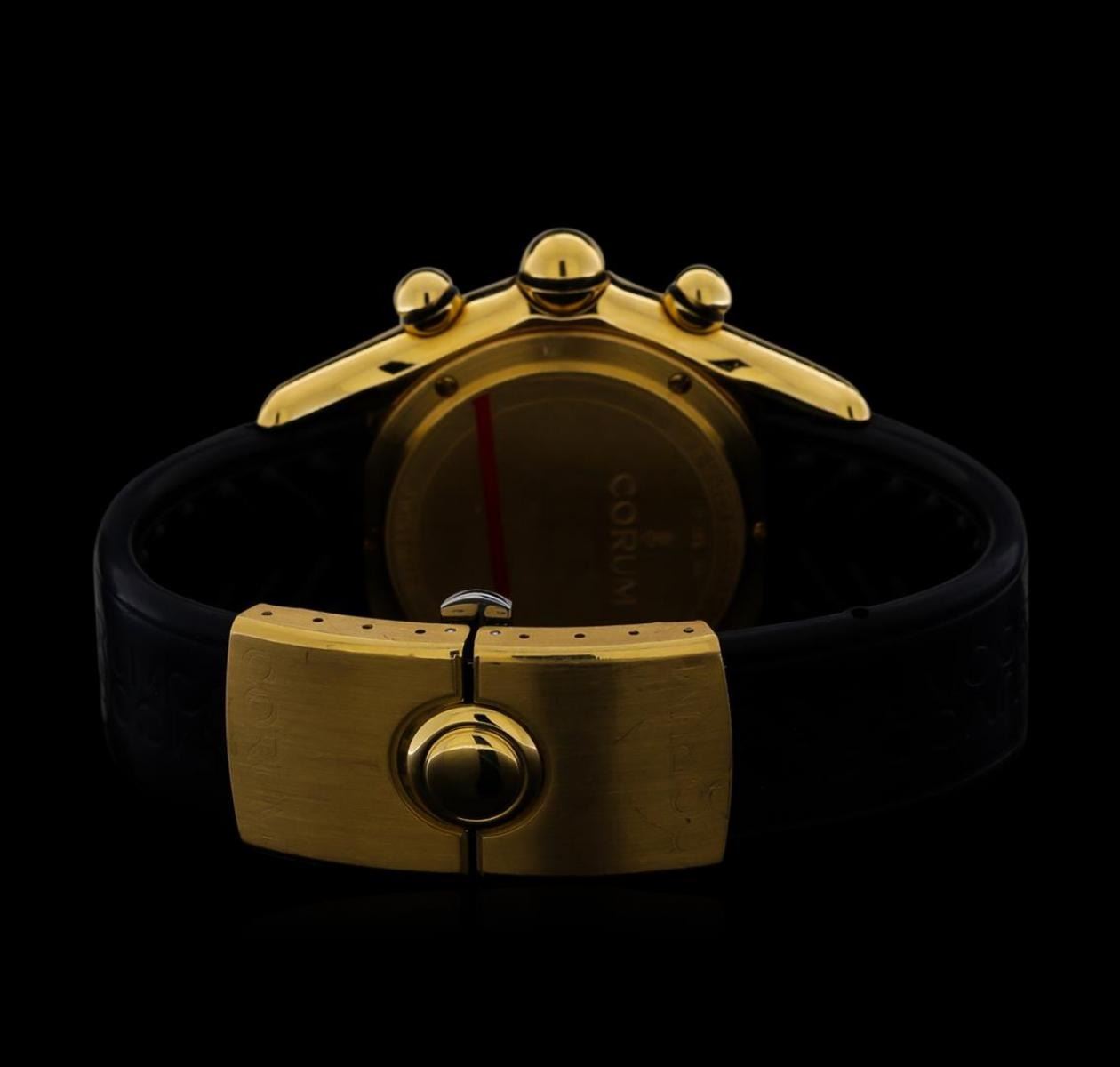 One Corum Bubble men's watch featuring: Case: 18KT yellow gold. Bezel: 18KT yellow gold. Crystal: Sapphire. Crown: Screwdown. Dial: Black color; Arabic numerals. Functions: Chronograph; date; small seconds sub-dial. Bracelet: Corum black rubber strap with 18KT yellow gold double fold over clasp. Water Resistance: 200m/660ft. Condition: Minor surface scratches on case, but otherwise there are no major signs of wear.