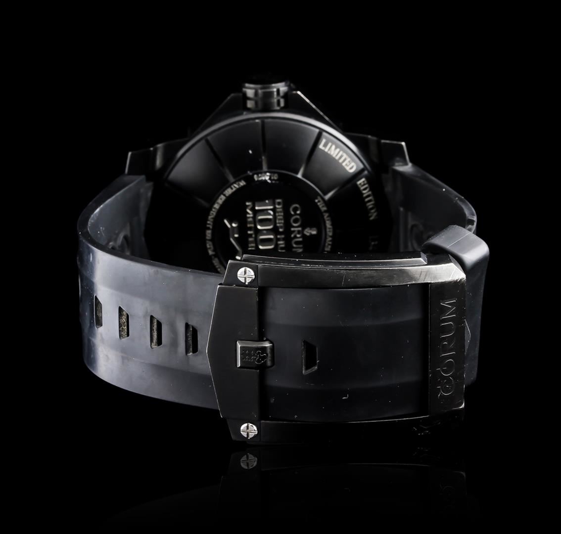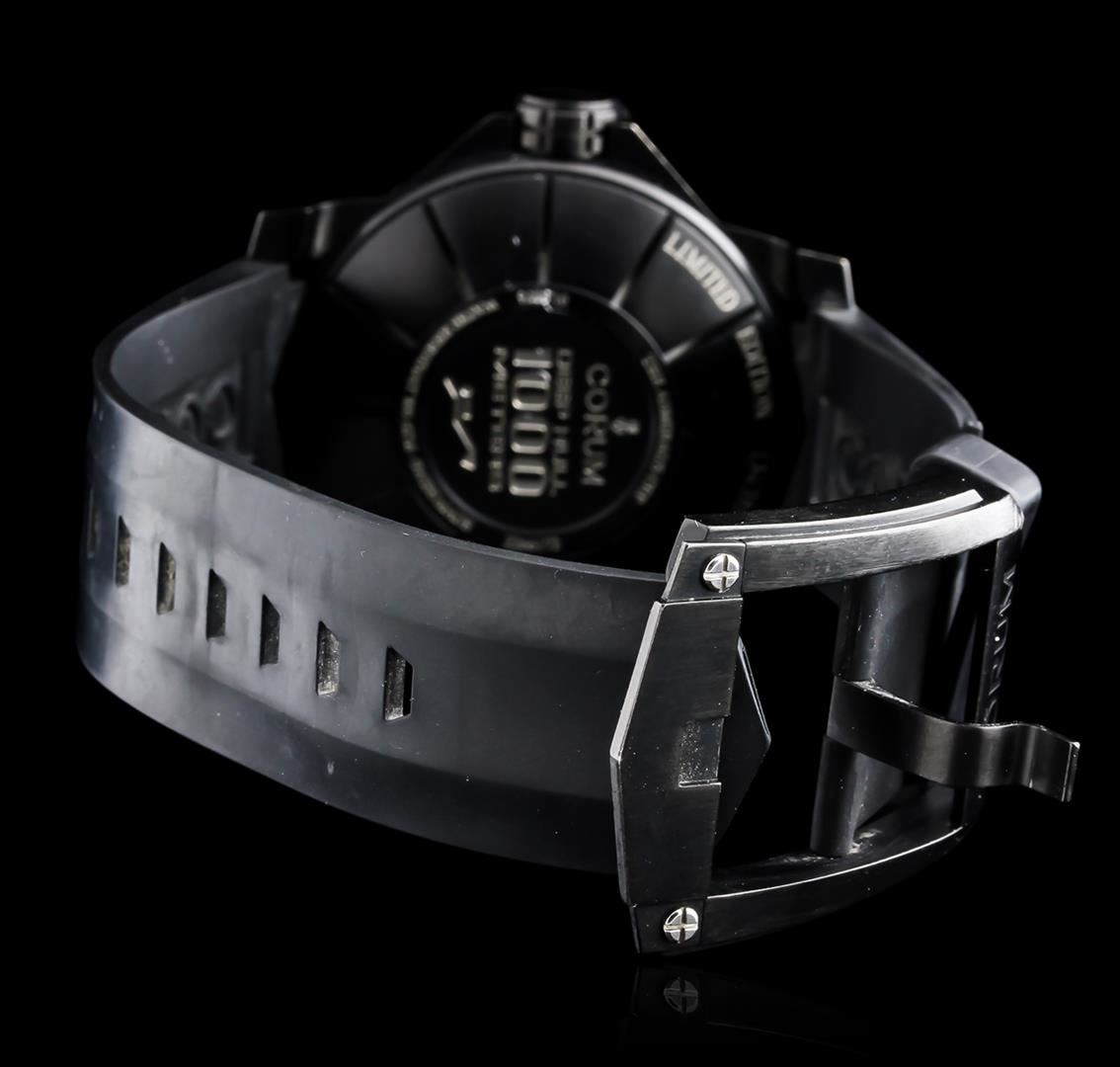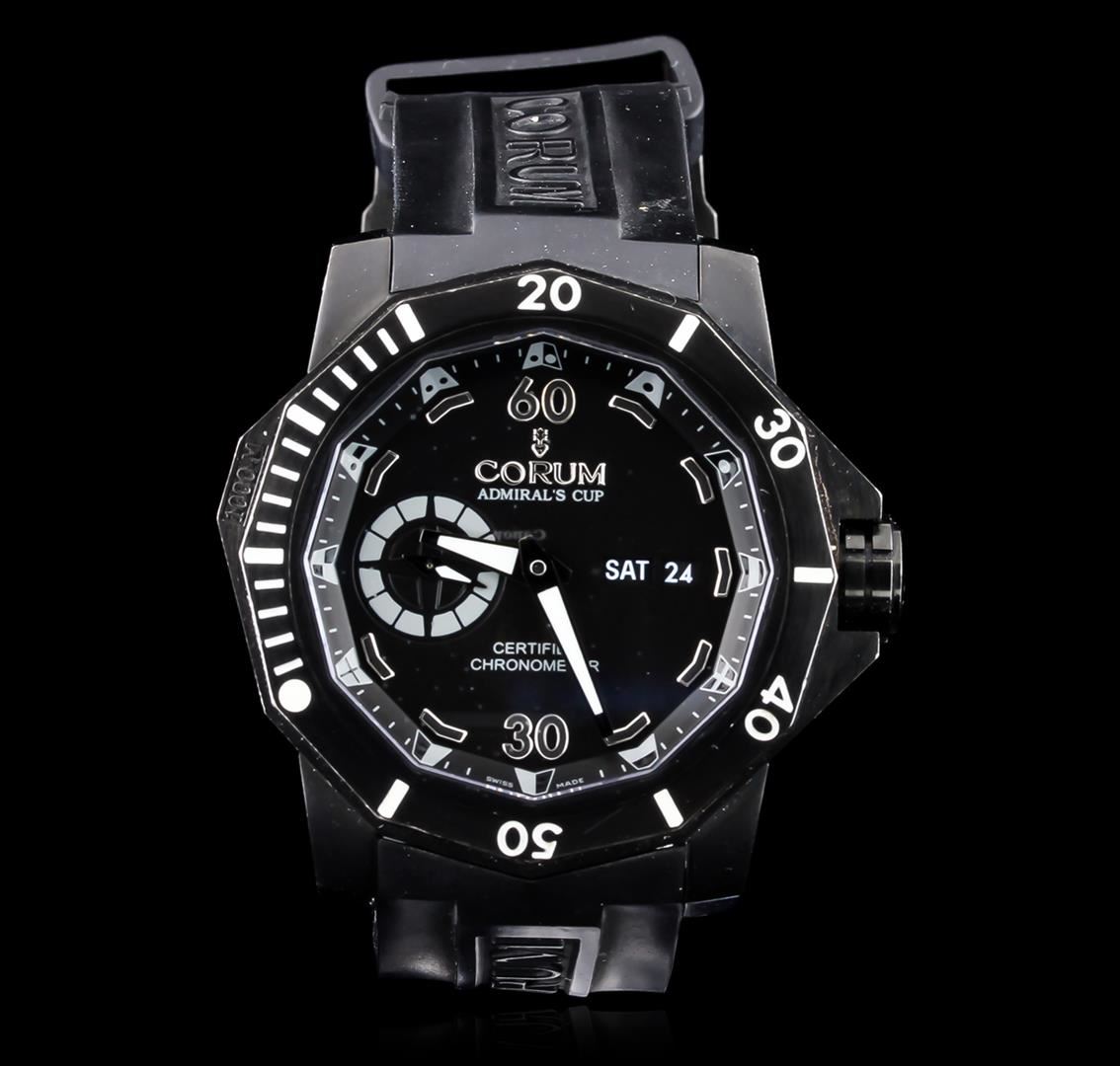 One Corum Admirals Cup Deep Hull wristwatch featuring: Case: Black PVD titanium with signed screw-lock crown and back. Bezel: Unidirectional rotating bezel with 60 minute immersion scale. Dial: Matt black with WG logo and hour indexes. Signed in grey. Small seconds with day and date apertures. Bracelet: Black rubber. Water resistant: 100 ATM.