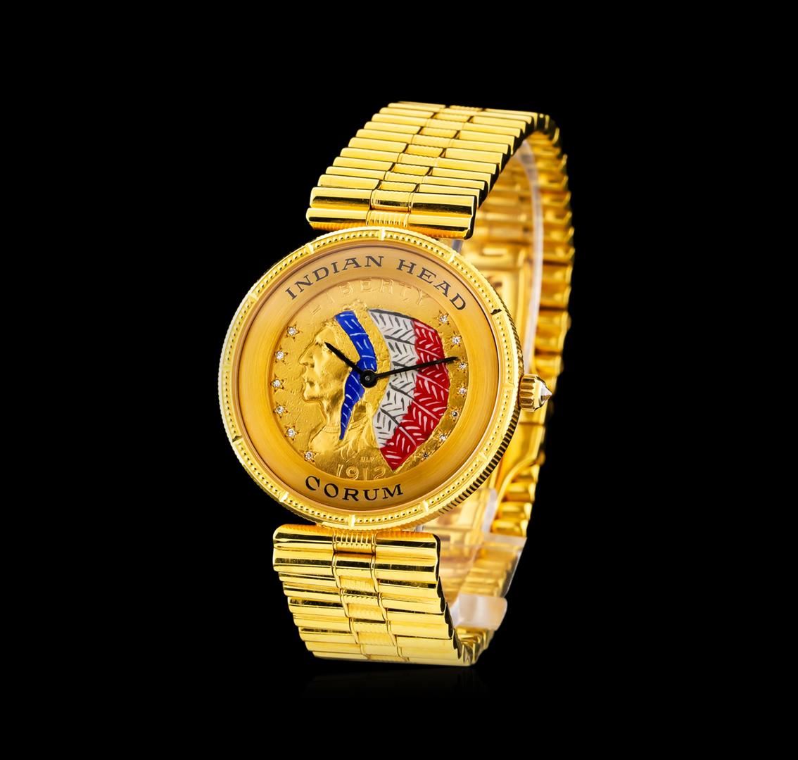 One Corum Five Dollar Indian Head watch featuring: Case: 31mm 18KT yellow gold. Case Shape: Round. Bezel: Engraved gold. Crystal: Sapphire. Dial: Gold $5 US Indian Head coin with diamonds and red, white, and blue accents and pointed baton-type hands. Band: 18KT yellow gold Corum band with clasp. Condition: light wear on the band but otherwise near perfect condition.