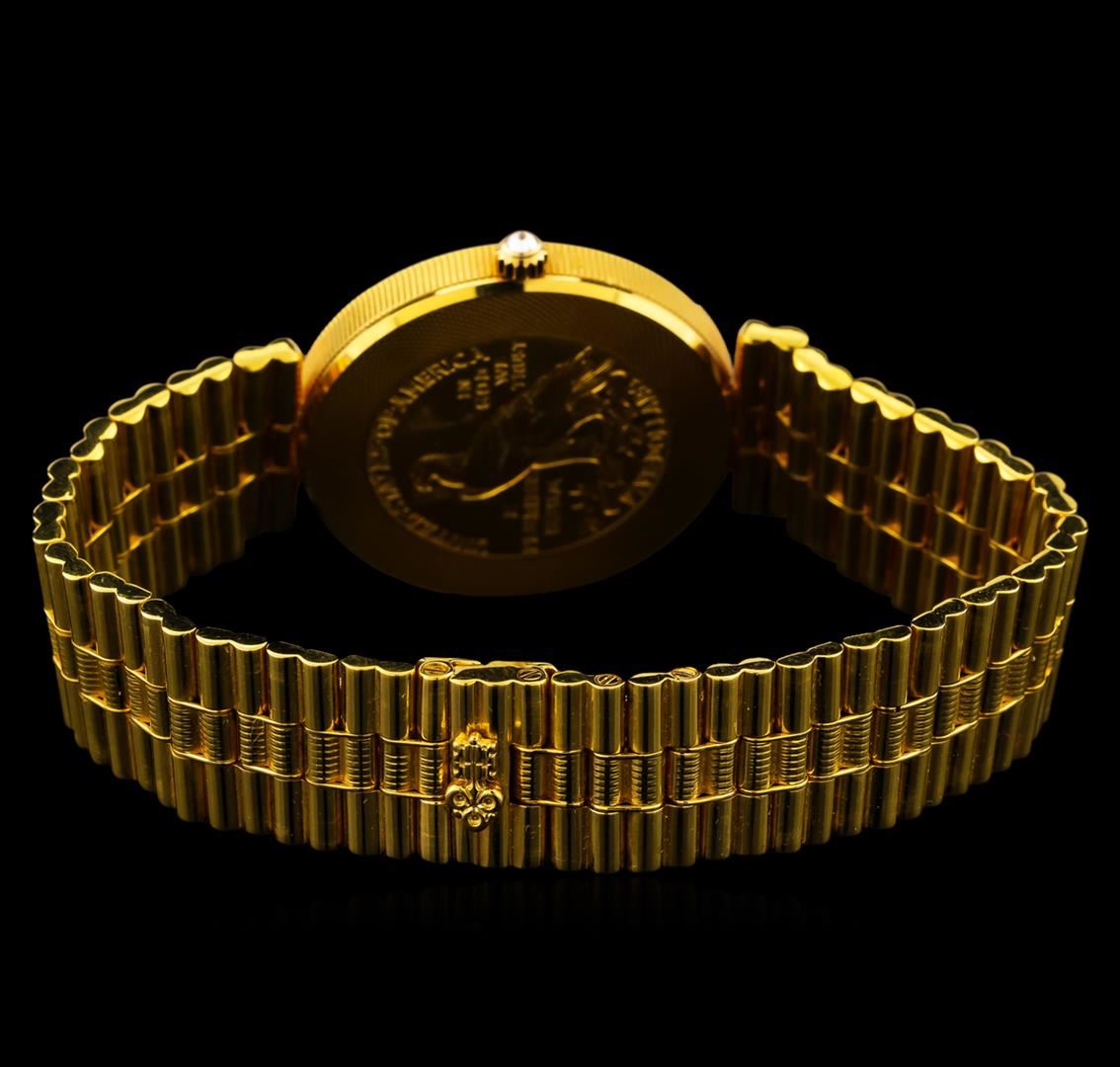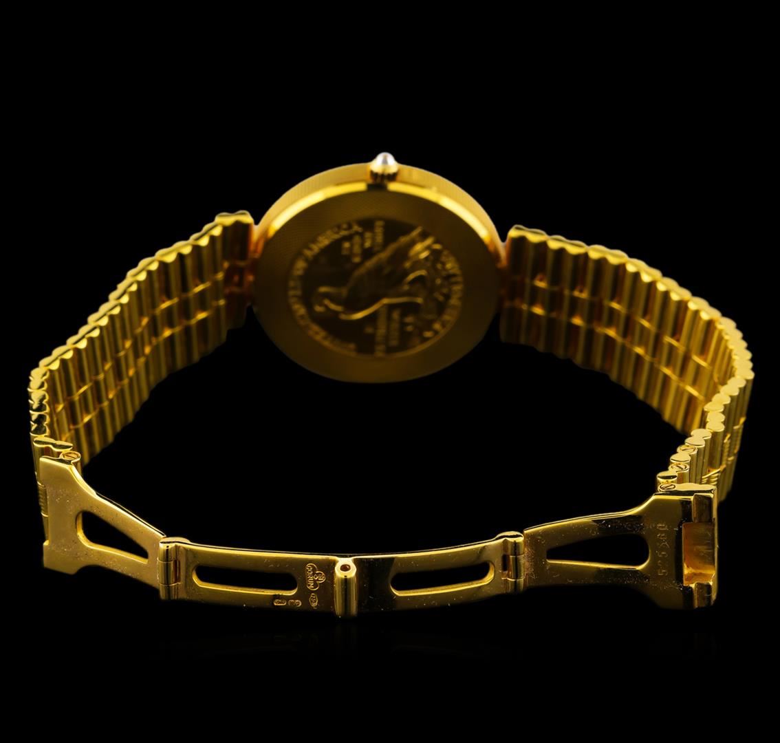 One Corum Five Dollar Indian Head watch featuring: Case: 31mm 18KT yellow gold. Case Shape: Round. Bezel: Engraved gold. Crystal: Sapphire. Dial: Gold $5 US Indian Head coin with diamonds and red, white, and blue accents and pointed baton-type hands. Band: 18KT yellow gold Corum band with clasp. Condition: light wear on the band but otherwise near perfect condition.