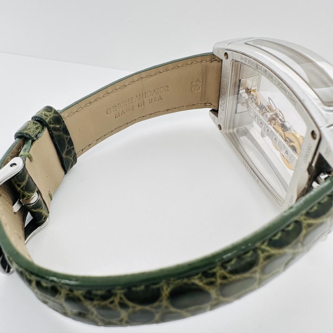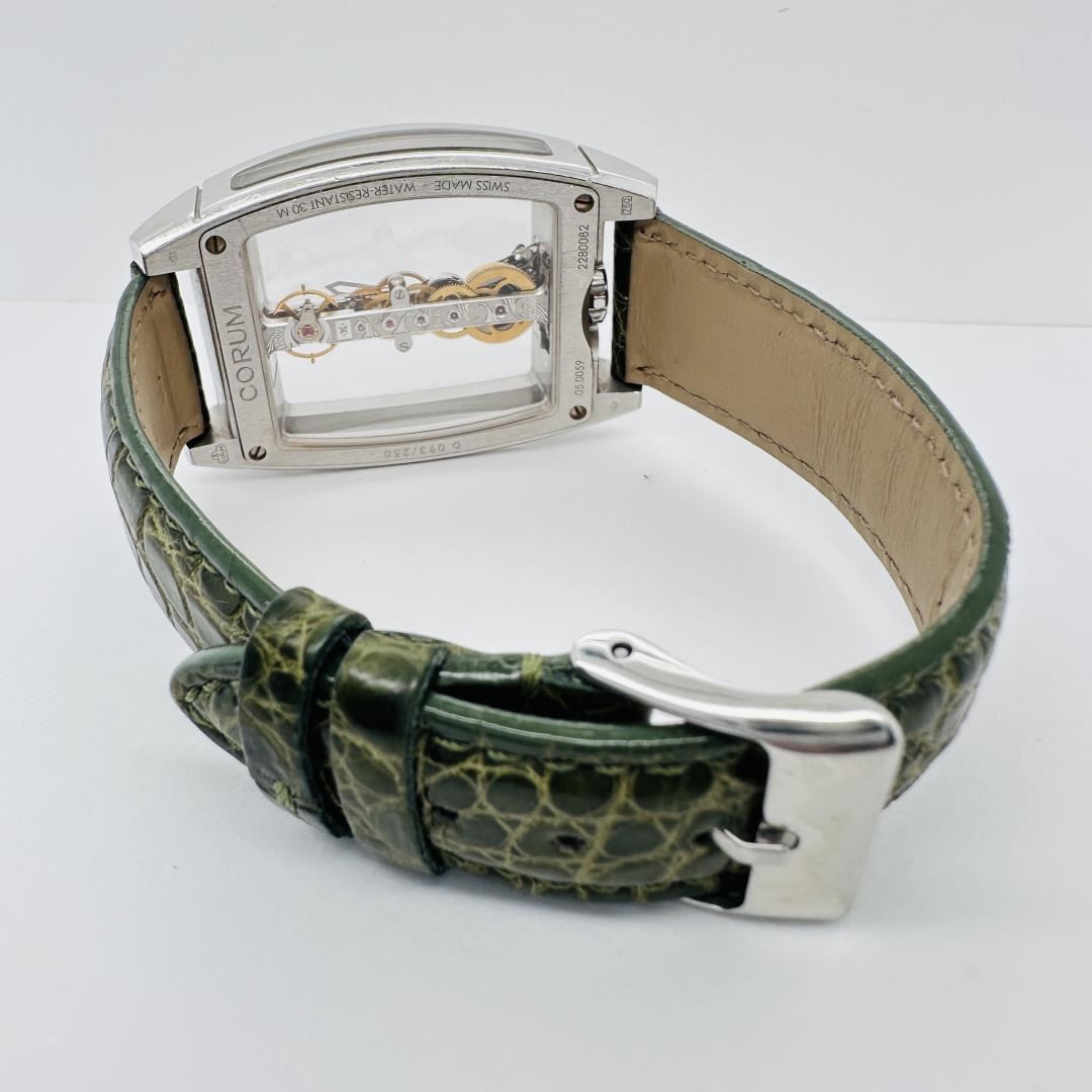 This Corum Golden Bridge Limited Edition is an extraordinary timepiece featuring Corum's iconic linear baguette movement, displayed in a fully transparent case design. The 18k white gold case is set with two rows of brilliant diamonds along the bezel, enhancing its elegance and rarity. Paired with a green alligator strap and numbered 093/250, this highly collectible watch exemplifies both horological mastery and luxurious style.