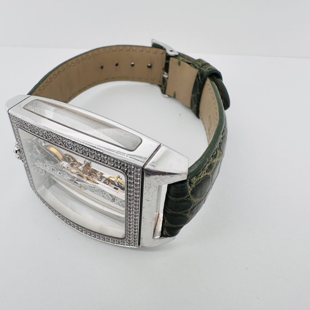 This Corum Golden Bridge Limited Edition is an extraordinary timepiece featuring Corum's iconic linear baguette movement, displayed in a fully transparent case design. The 18k white gold case is set with two rows of brilliant diamonds along the bezel, enhancing its elegance and rarity. Paired with a green alligator strap and numbered 093/250, this highly collectible watch exemplifies both horological mastery and luxurious style.