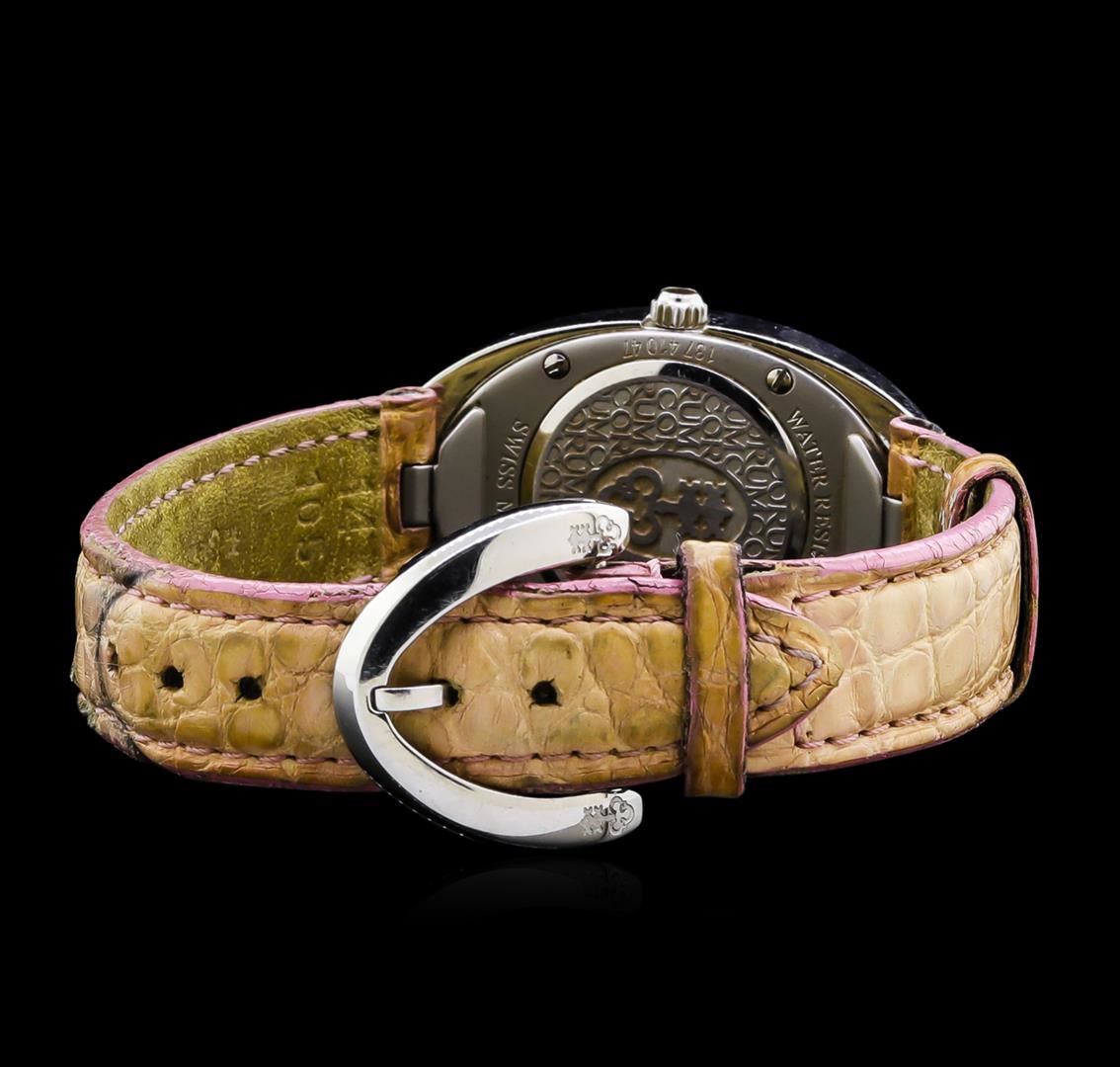 One, Lady Corum Diamond wristwatch electronically tested Stainless Steel, Case: 40 x 24mm, Case Back: engraved with manufacturers name, logo, and ID numbers, Crown: scalloped, Bezel: diamond set, Crystal: domed synthetic sapphire lens, Movement: Swiss quartz. Corum Dial: Pink mother of pearl; with baton hands, Corum Bracelet: saddle stitched leather strap, Condition: G-5 Fine. Seven inch length, adjustable. Buckle clasp, with logo. Containing: Sixty Two round brilliant cut diamonds approximate total weight of stones equals 1.00ct. Set & graded in the bezel. Clarity: VVS-1 to VS-1. Color: F - G. Total Weight of Diamonds 1.00ct. Total Weight of Watch 34.71gm. AIG Appraised at $5,050.00.
