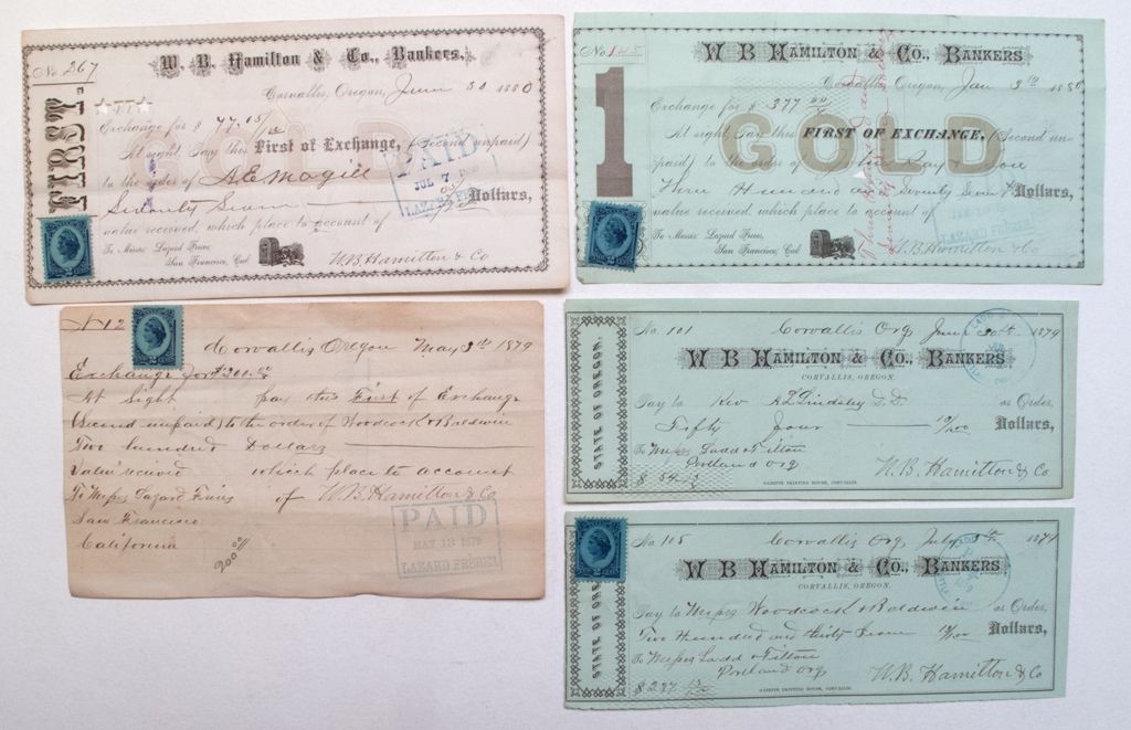 Four Corvallis revenue stamped documents. All W. B. Hamilton & Co., Bankers. One check. Two different First of Exchange (gold written in gold). One hand written First of Exchange. Handwritten is check number 12.City: CorvallisCounty: BentonState: OR