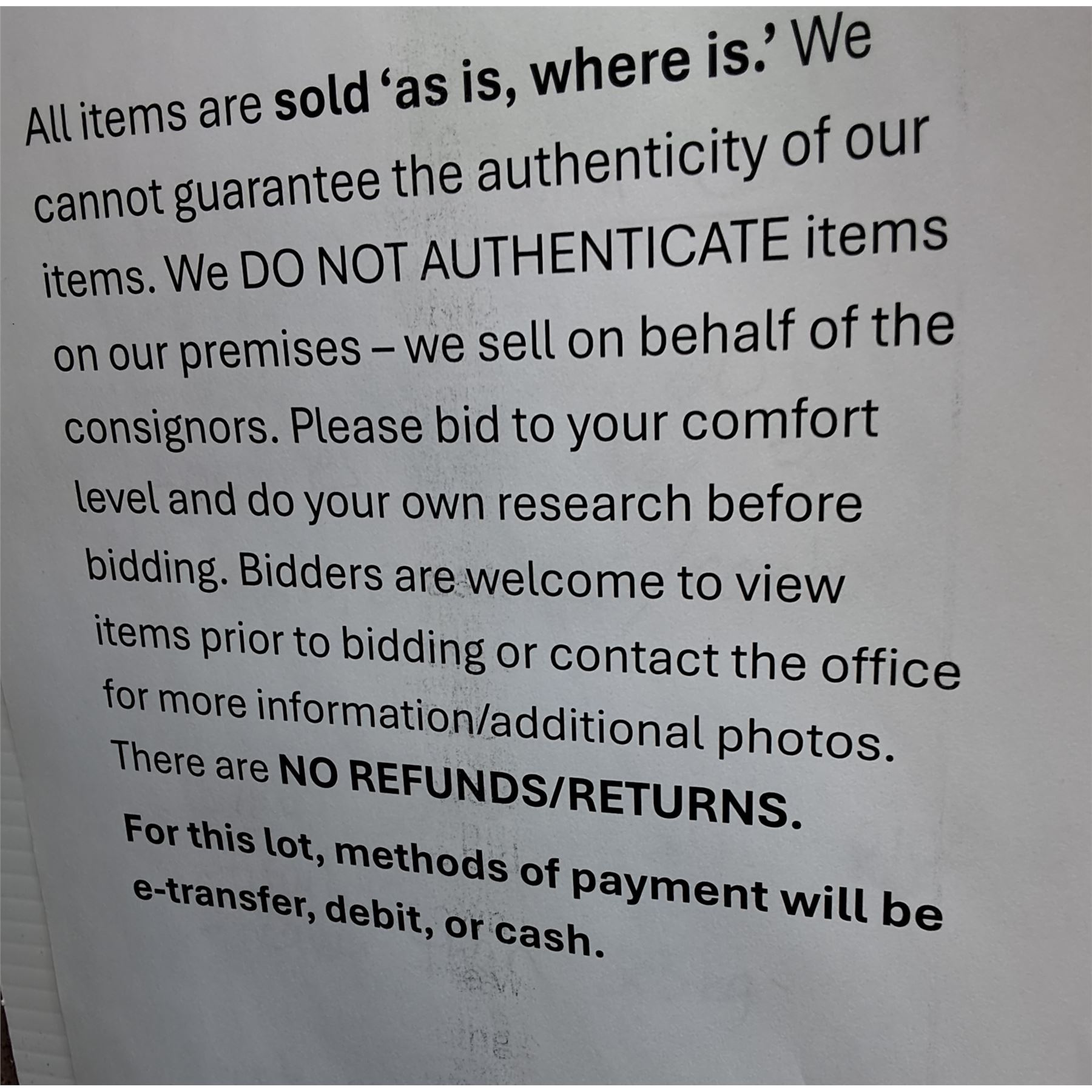 A online bidding premium may be applied to each lot purchased on the Internet. Federal GST and corresponding Provincial Sales Tax will apply to all purchases where applicable.