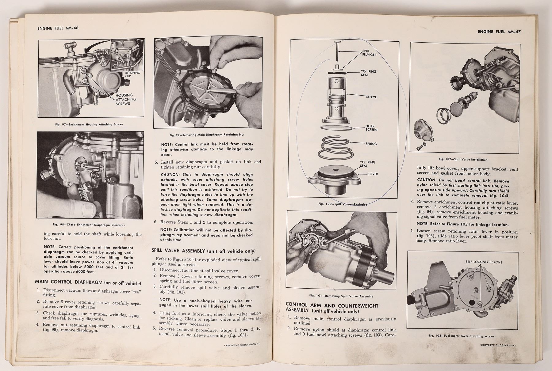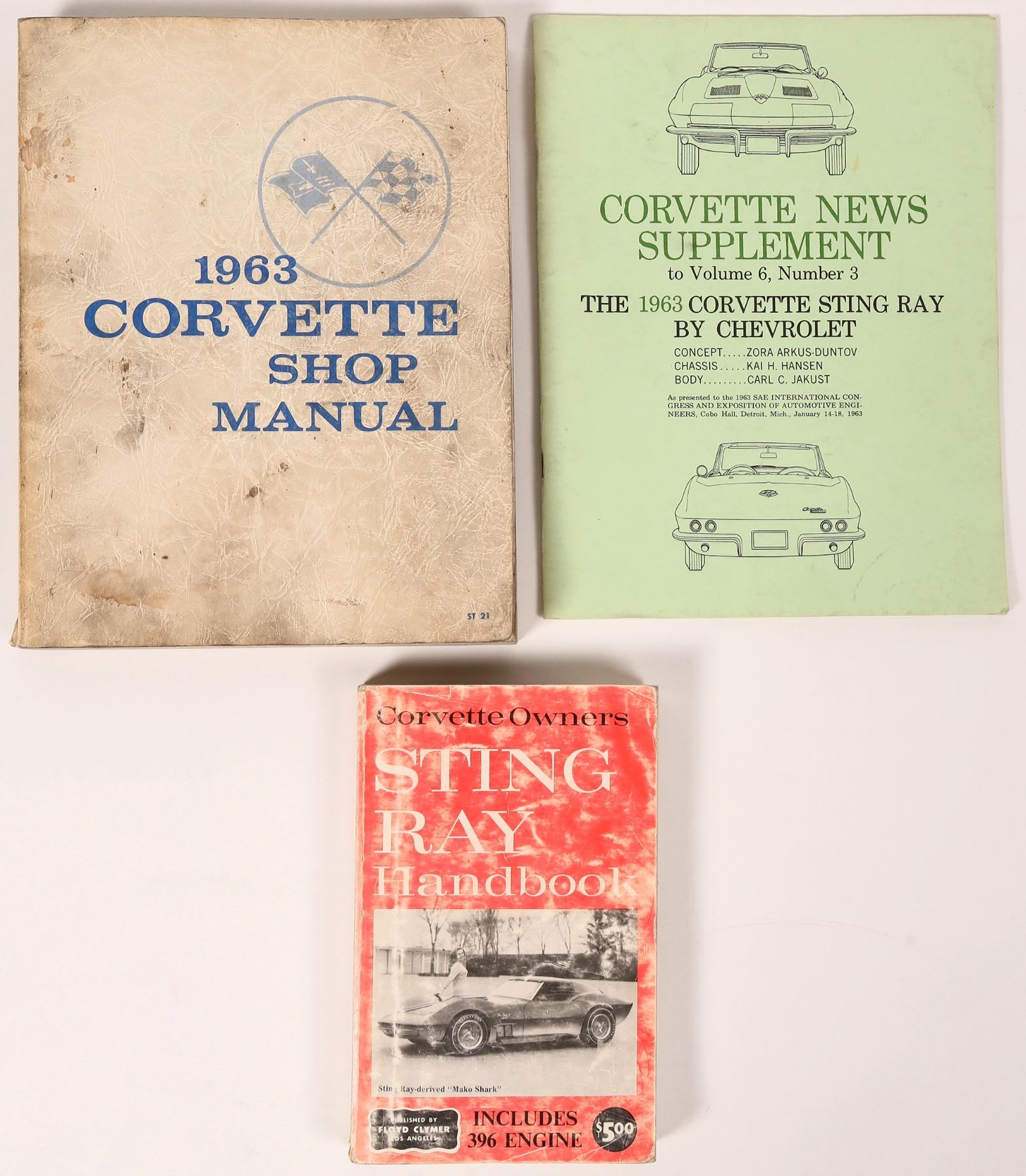This lot contains the 1963 Corvette Shop Manual printed in 1962. The cover is soiled with brake dust and coffee stains (of course). In good original condition. The real show stopper is the "Corvette News Supplement vol.6 number 3/ The 1963 Corvette Sting Ray By Chevrolet" authored by Zora Arkus-Duntov, Chassis by Kai Hansen, Body by Carl Jakust as presented to the "S.A.E. International Congress and Exposition of Automotive Engineers. Colo Hall, Detroit, Mich., January 14-18, 1963". 30pp. covering the 1963 Corvette. This is reprinted by permission of GM and is THE event that puts Corvette front stage internationally. Paperback in excellent condition; a rare document. A third book, "String Ray Handbook" by Clymer, 449pp. heavily notated, paperback, good condition.