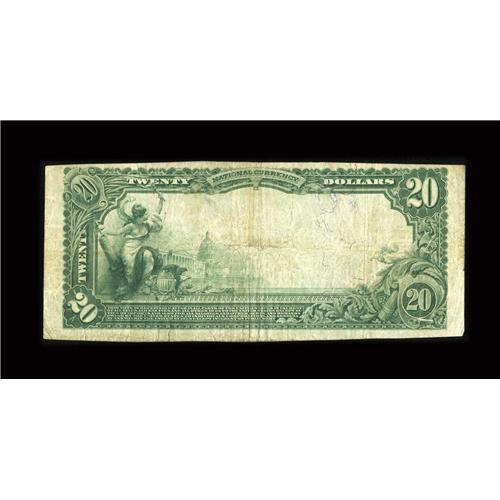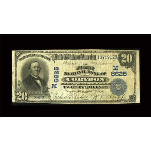 <B>Corydon, IN</B></I> - $20 1902 Plain Back Fr. 650 <B>The First NB</B></I> Ch. # (M)6625<BR>A very rare Indiana note from a bank which went out in 1920. The census shows just two notes extant from here, the last of which we sold in 2002 for $2990. Expect this piece, which grades <B>Fine-Very Fine</B></I> and is a bit nicer, to equal or exceed that number.<BR><BR><b>Shipping:</b> Coin/Currency (<a target="_blank" href="http://www.heritageauctions.com/common/shipping.php">view shipping information</a>)