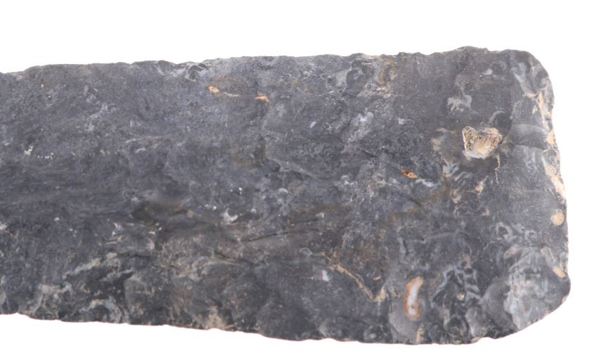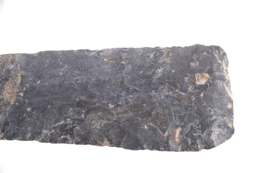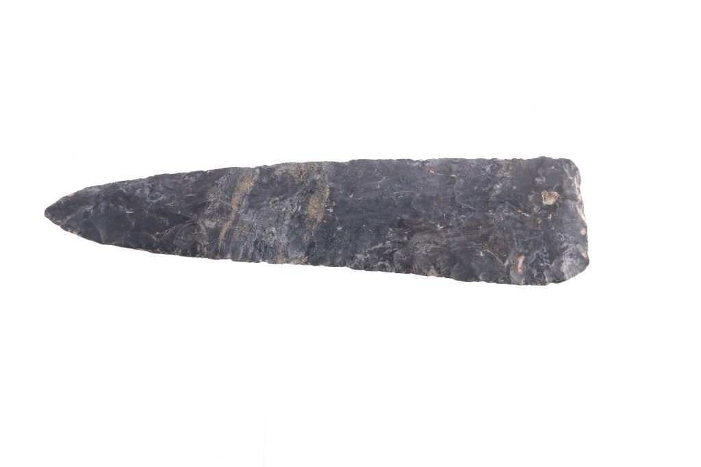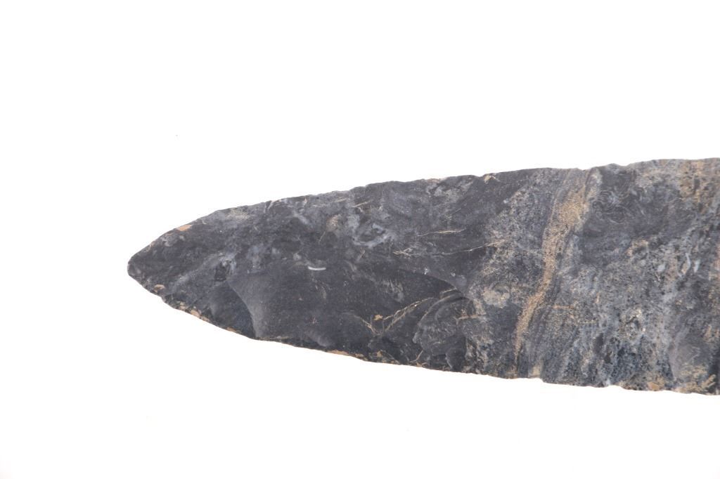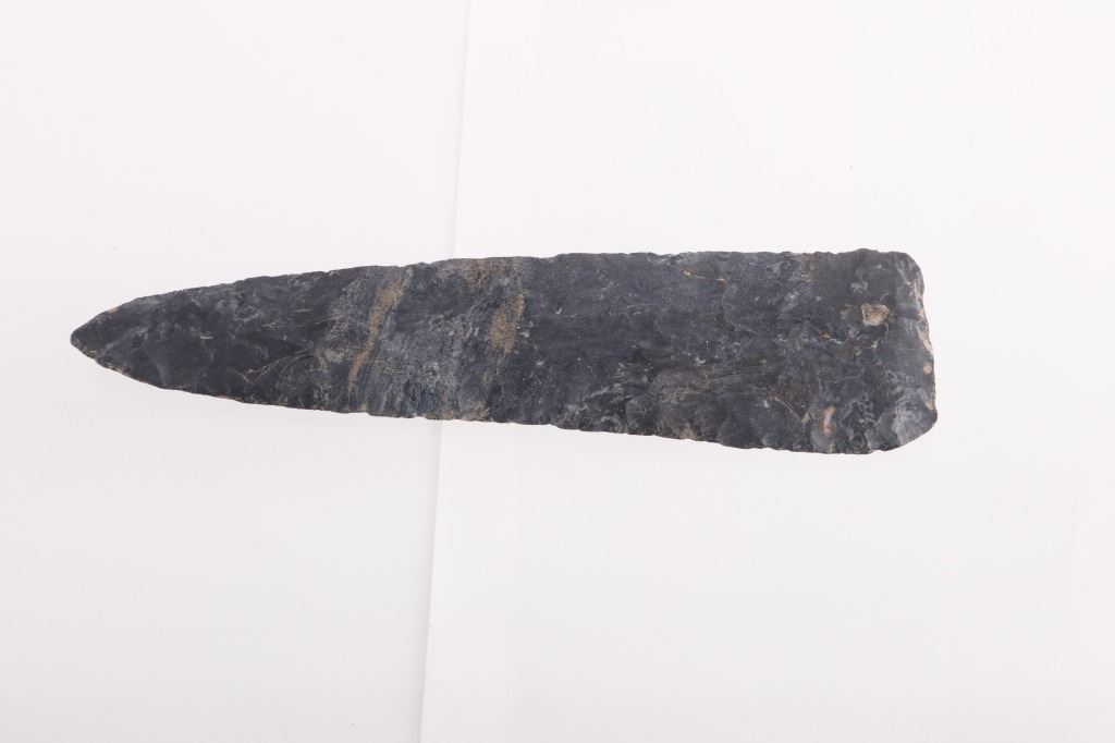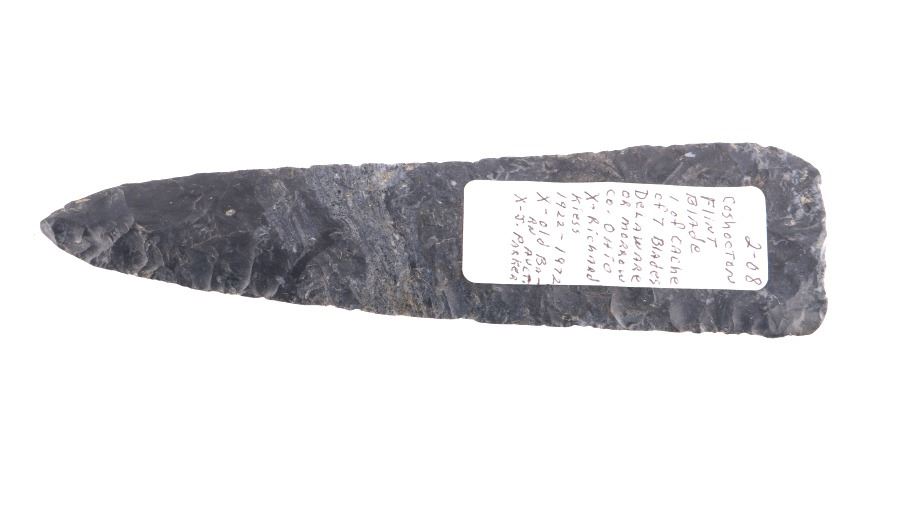Featured in this lot is this Coshocton Anzick Clovis Point from the Paleo Period and aged from 15,000-10,000 B.P. This is a large triangular point with elliptical cross section and an excurvate blade with the tip curving to become almost parallel. It is knapped from flint material. The condition of this point is good, with no obvious signs of damage. The measurements of this point are 7 1/4" x 2". Provenance: This flint blade is one of seven blades in Morrow Co., Ohio. It passed hands to the private collection of Richard Kiess (1922-1972) and was featured in Old Barn Auction and sold to a private collector, J. Parker.