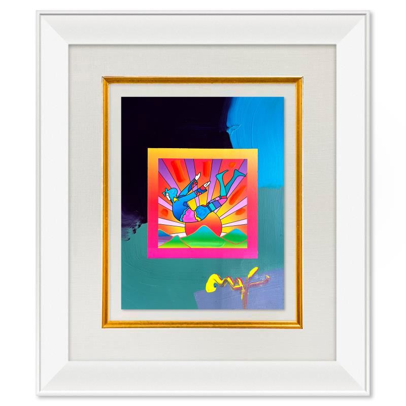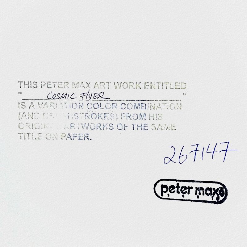 "Cosmic Flyer" is a hand signed one-of-a-kind acrylic mixed media on paper by Peter Max. The piece comes custom framed with a backside cutout to display Peter Max Studio registration number 267147 certifying authenticity. Measures approximately 30" x 26" (frame), 17" x 13" (image). This item requires special handling and may have a longer than usual turnaround.