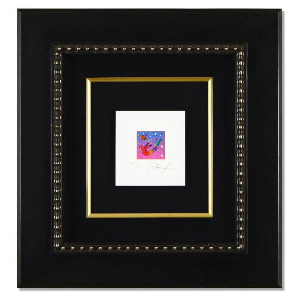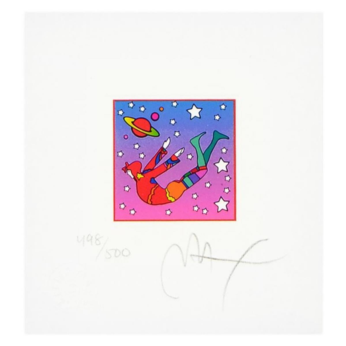"Cosmic Flyer in Space Ver II" is a limited edition lithograph on paper by Peter Max, numbered 498/500 and hand signed by the artist. This piece comes framed. Includes Certificate of Authenticity from Peter Max Studios. Measures approximately 17" x 18.5" (frame), 4.5" x 5" (image).