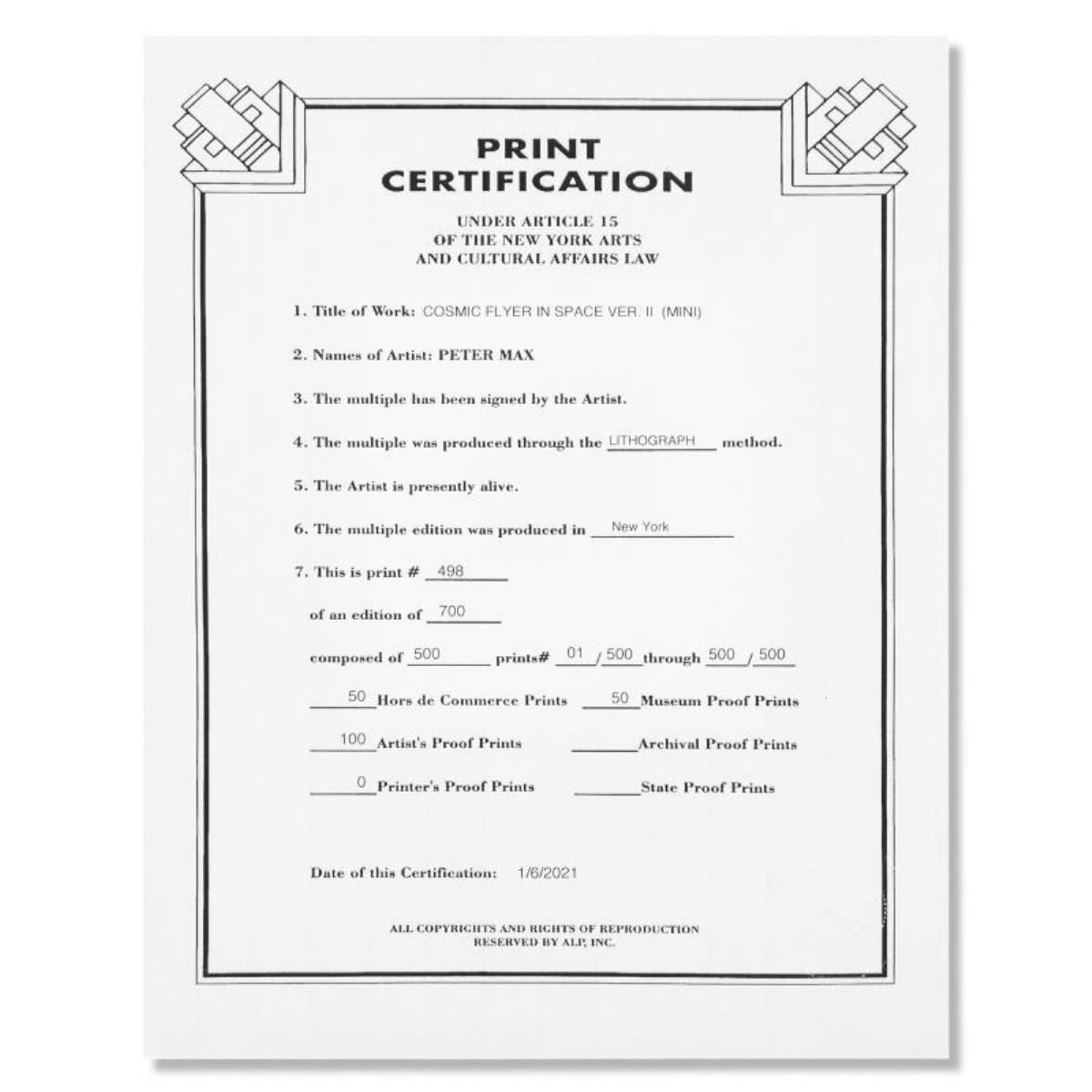 "Cosmic Flyer in Space Ver II" is a limited edition lithograph on paper by Peter Max, numbered 498/500 and hand signed by the artist. This piece comes framed. Includes Certificate of Authenticity from Peter Max Studios. Measures approximately 17" x 18.5" (frame), 4.5" x 5" (image).